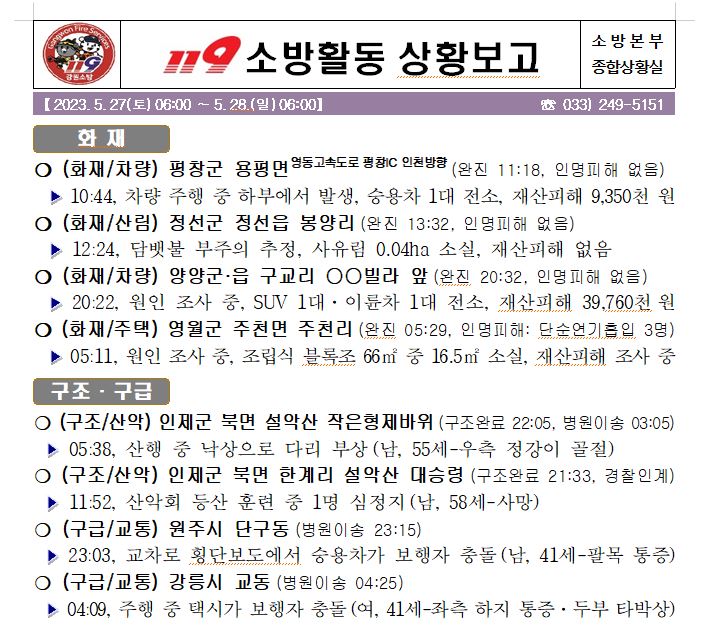 119 소방활동 일일상황보고(5.28.일) 06:00