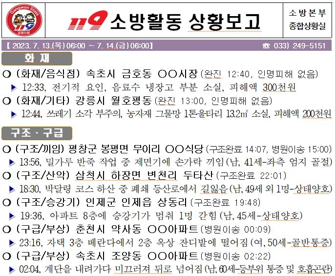 119 소방활동 일일상황보고(7.14.금) 06:00
