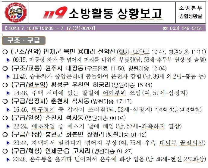 119 소방활동 일일상황보고(7.17.월) 06:00