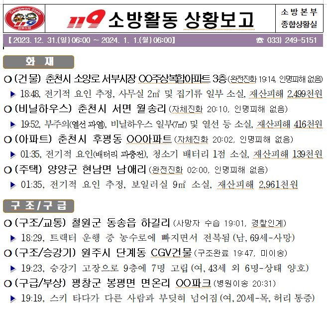 119 소방활동 일일상황보고(1.1.월) 06:00