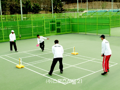 그러나 상급자에 있어서는 톱스핀이나 백스핀 등을 많이 사용해서 변화 있는 게임을 전개함으로써, 싫증나지 않고 즐거운 스포츠입니다.종래의 직장에서 레크레이션 스포츠에서, 지역의 학교에도 커뮤니케이션 스포츠로 넓게 등장하고, 가족 스포츠로 아파트 주차장, 옥상, 공원 등 작은 공간에서도 즐길 수 있습니다.경기에 필요한 코트는 크레이(흙), 아스팔트, 시멘트, 케미칼 등 어느 곳에서나 볼이 바운드 할 수 있는 평지이면 게임이 가능하며 장소에 구애받지 않고 즐길 수 있는 스포츠 입니다.