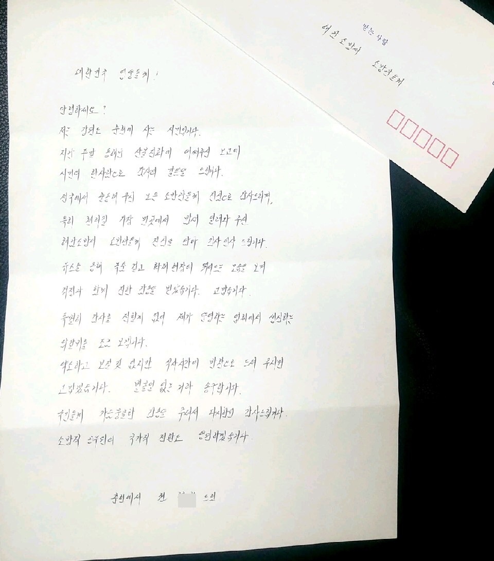 발송하신분은 한 속초시민... 강원도 산불 진압을 위해 가장 먼곳에서 밤새 달려와주신 해남소방서 소방관들게 감사하다는 편지와 함께 닭갈비를 동봉하여 택배로 보내주셨습니다.