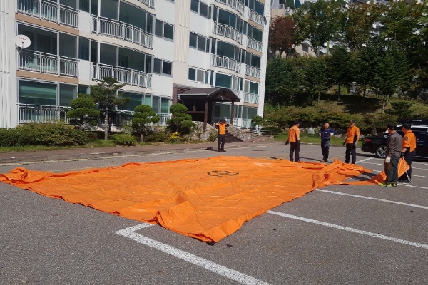 이번 훈련은 고층 건물에서 화재 발생 시 피난층으로 탈출이 불가능한 경우를 대비해 마련됐다. 대상물마다 비치된 에어매트를 이용해 설치하는 방법과 사용 시 주의사항, 보관 방법 등으로 진행됐다.