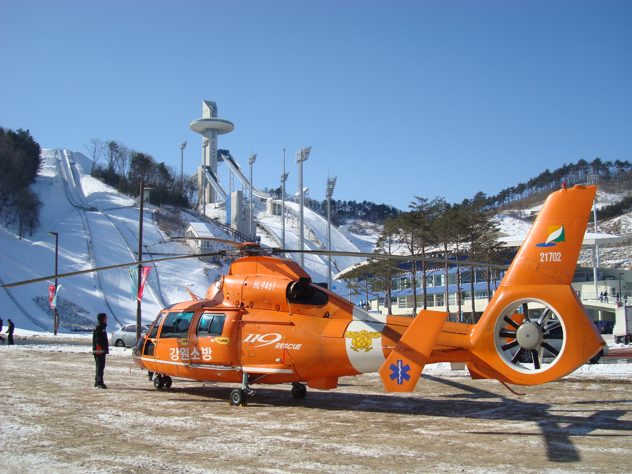 특별 소방안전대책 추진사항은 행사기간 중 스키점프 경기장 응급환자 발생시 신속한 응급처치를 위하여 119구조?구급활동 지원반(인원 4명, 차량2대)을 24시간 운영하고, 사고 발생시 신속한 환자 이송을 위하여 소하여 평창 알펜시아 스키점프 계류장에 소방헬기 1대(인원 5명)를 배치 운영하고 있다.