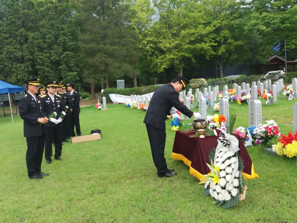 강원도소방본부(본부장 이흥교)에서는 17일 오전 11시 국립대전 현충원에서 ‘14년 7월 17일 세월호 수색지원출동 중 헬기추락으로 순직한 소방공무원을 추모하기 위해 강원도 특수구조단원 30명이 묘역을 찾아 헌화 및 참배행사를 가졌다.