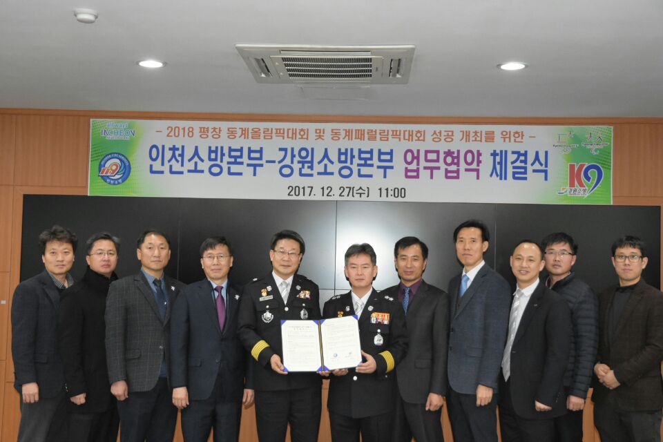 강원도소방본부는 12월 27일 인천소방본부 영상회의실에서「2018년도 평창 동계올림픽 및 동계 패럴림픽대회의 성공적 개최와 대테러 공동대응‧지원을 위한 상생협력 업무 협약식」을 체결했다고 밝혔다.