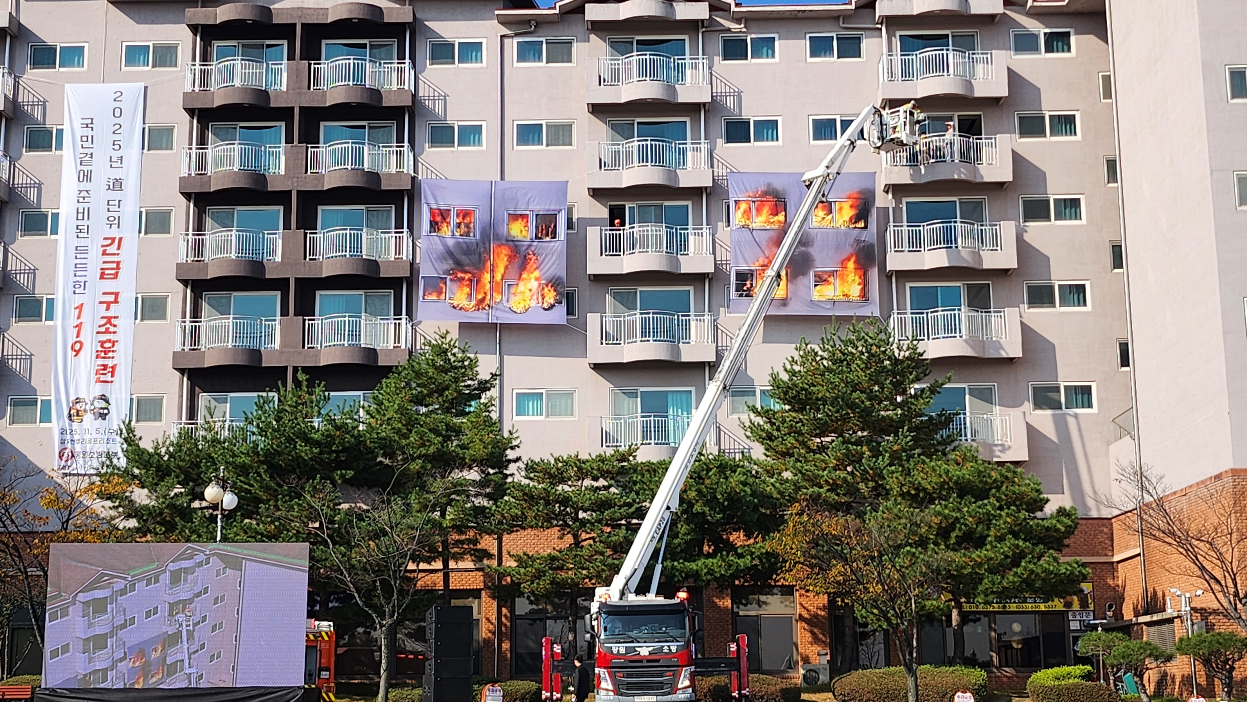 ○ 이번 긴급구조종합훈련은 건물 내 폭발화재와 산림화재로의 연소확대 등 대형 재난 발생을 가정해 진행되었으며, 리조트 내 자위소방대 활동, 긴급구조지휘대 및 현장응급의료소 설치‧운영(다수사상자 대응), 긴급구조통제단의 효율적인 운영 및 유관기관과의 유기적인 공조체계 확립에 중점을 두고 시행됐다.