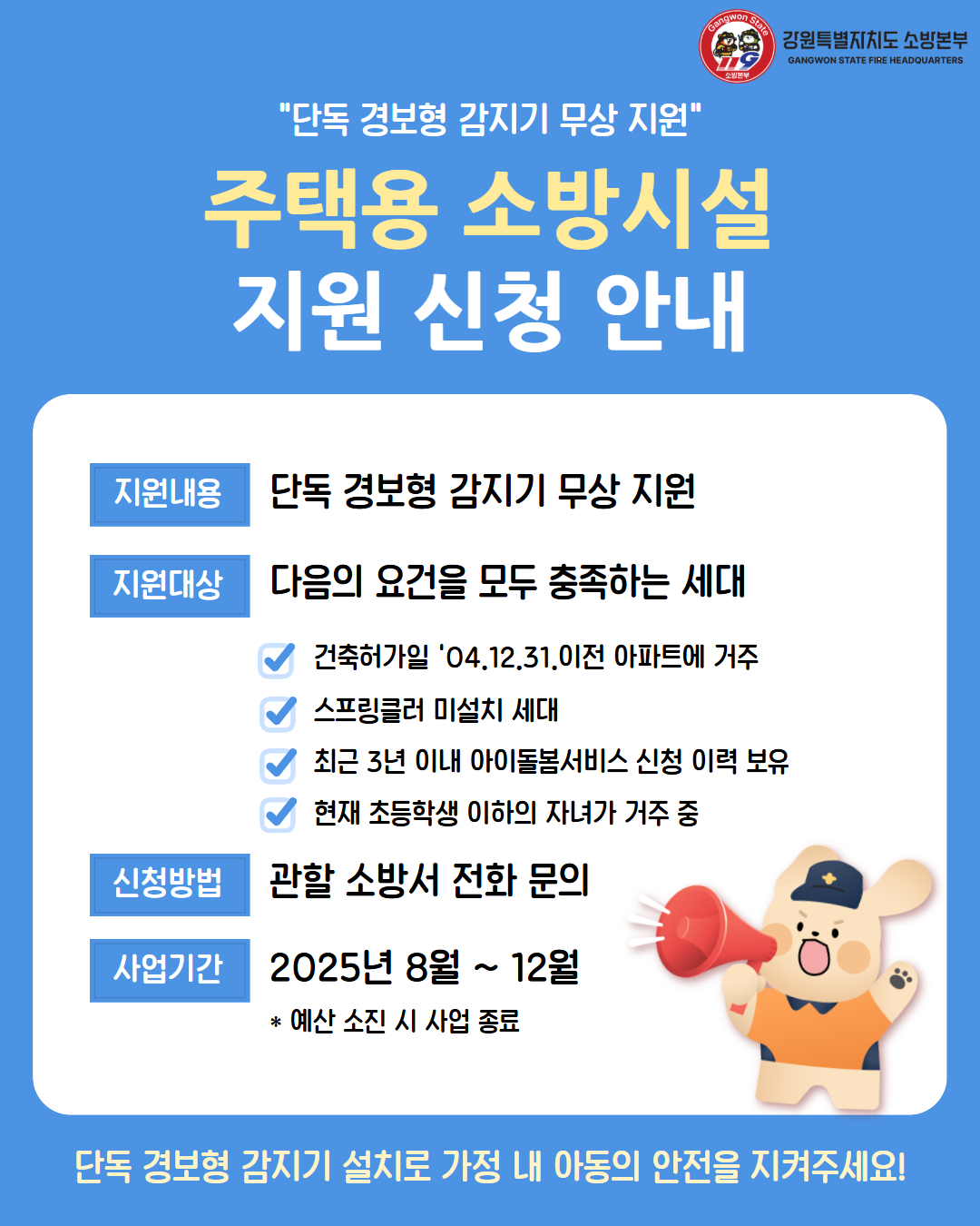 ○ 오승훈 소방본부장은 “돌봄 공백 세대의 화재 안전망을 강화하는 계기가 되길 바란다.”며, “지원 대상 세대는 꼭 신청하여 소중한 아이들의 생명을 지키는 데 동참해 주시기 바란다.”고 말했다.