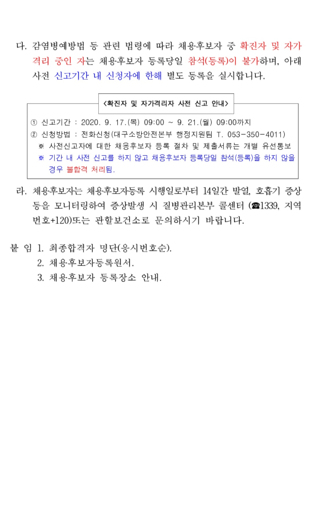 코로나 확진자 및 자가격리자의 채용후보자등록 문의