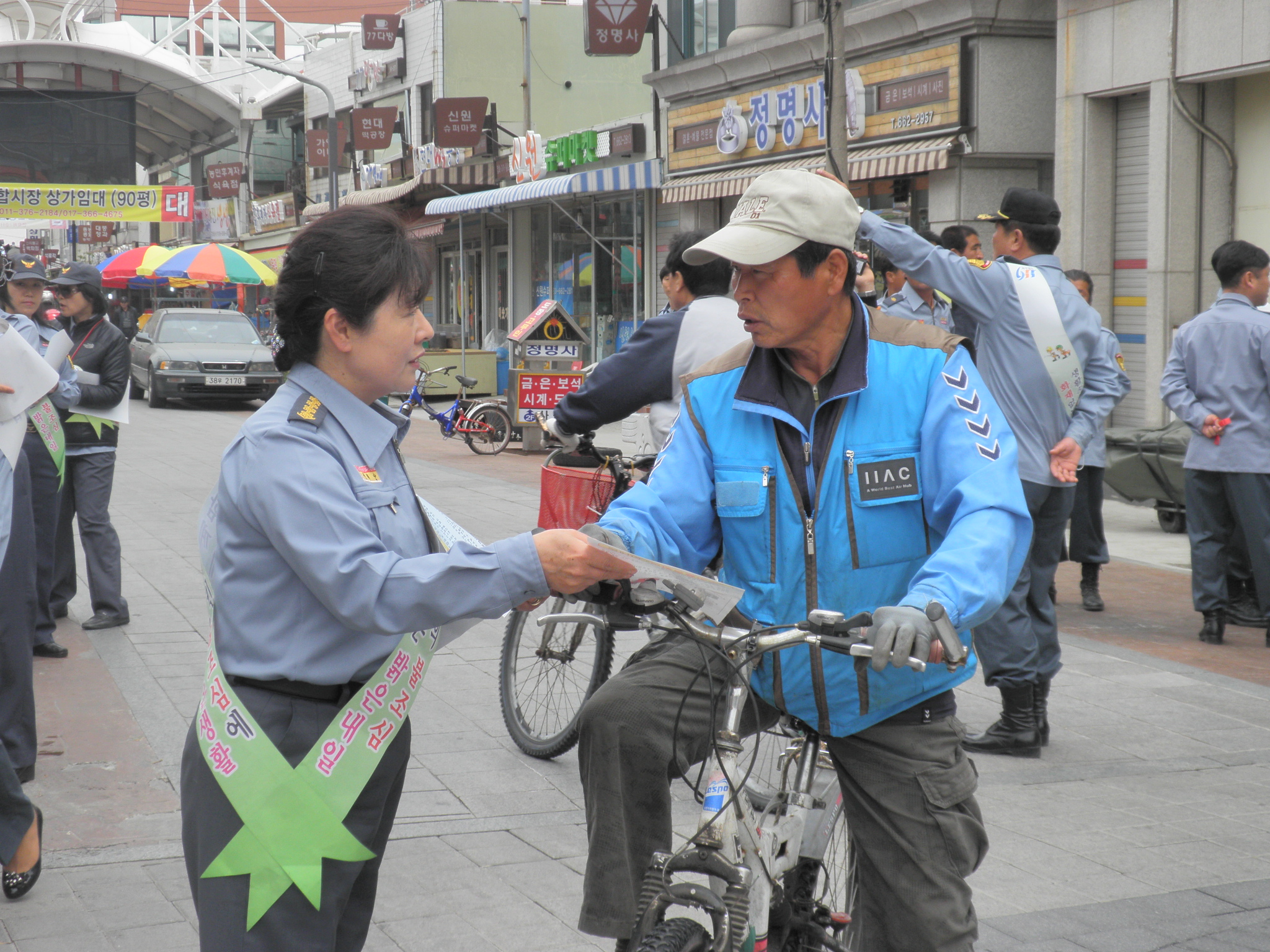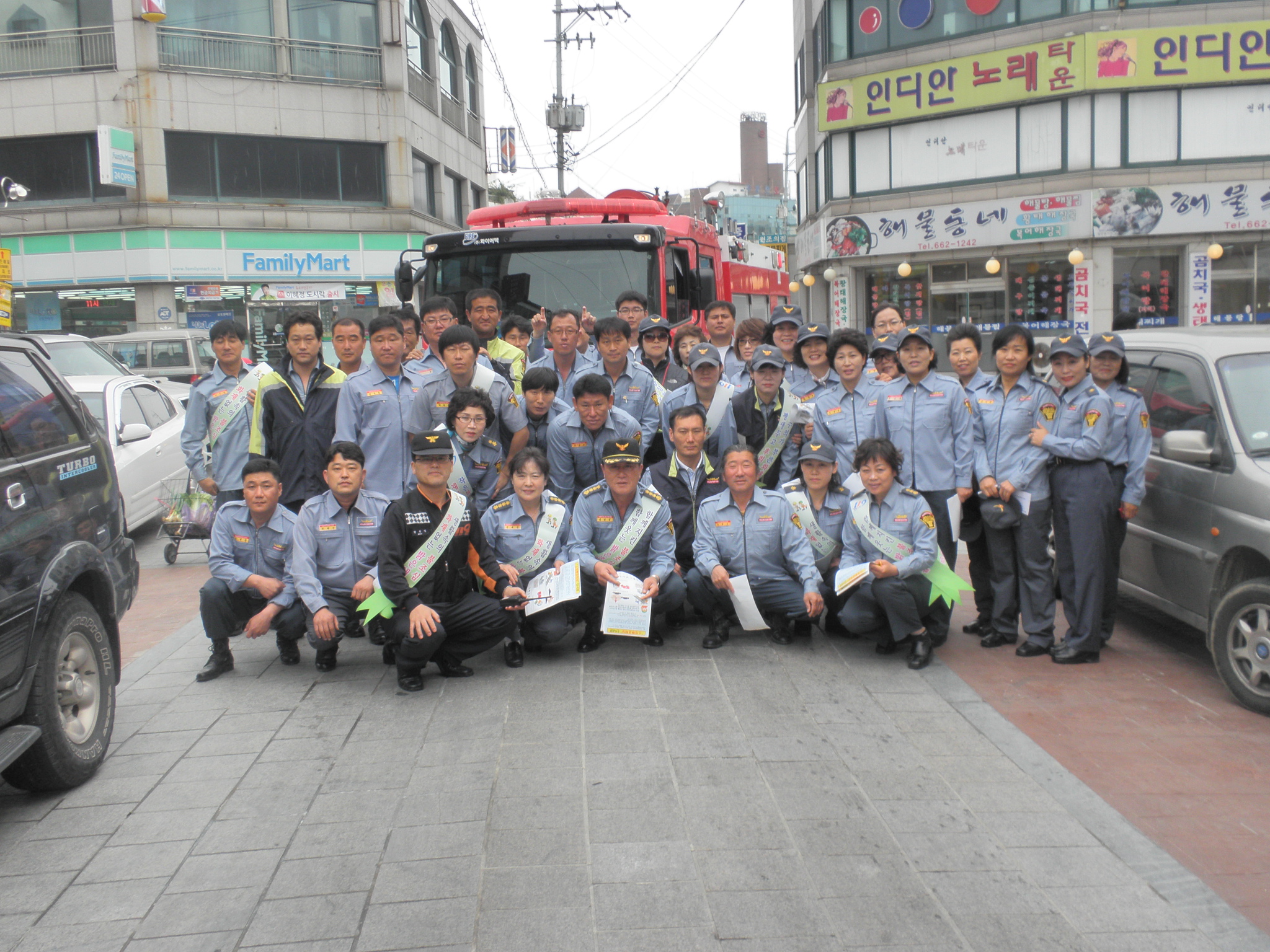 신 애순 대장님 ,김 남길 회장님 , 재난 훈련및 주문진시장 소방 통로 확보 전단지 홍보