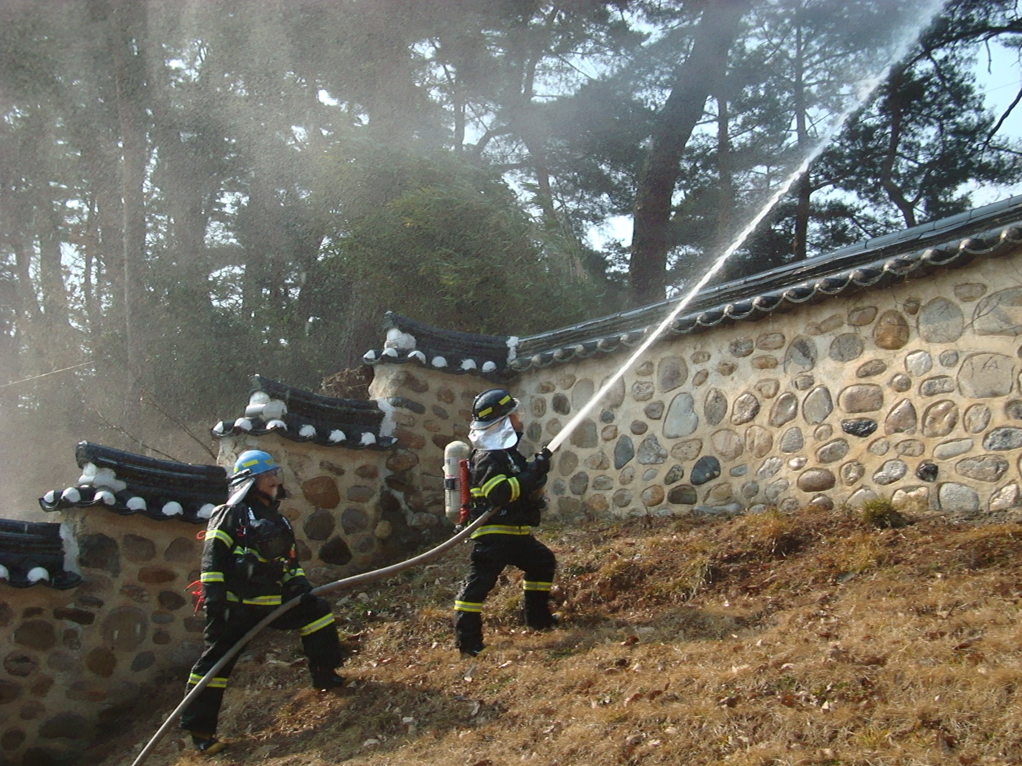 이날 훈련내용은 해운정문화재에 화재발생시 신속한 대응으로 피해를 최소화하고 동시에 인근 야산으로 연소되는 화재를 막는데 중점을 두었고 참석인원은 12명(소방9,시청3)과 장비 4대(펌프1,구급1,지휘1,산불진화1).가 참석하였다.