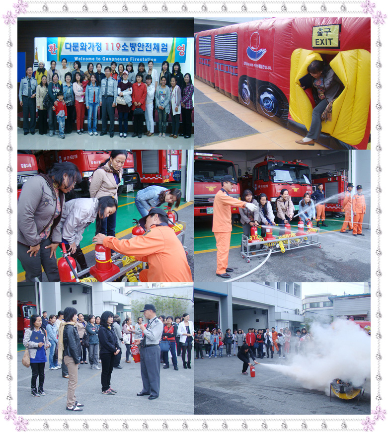 강릉소방서(서 장 : 김 기 성)에서는 10월22일(목) 강릉 시에 거주하는 다문화가정 주부 40여명을 소방서로 초청하여 소화기를 직접 사용하여 보는 등 소방안전 체험 프로그램을 운영하였다