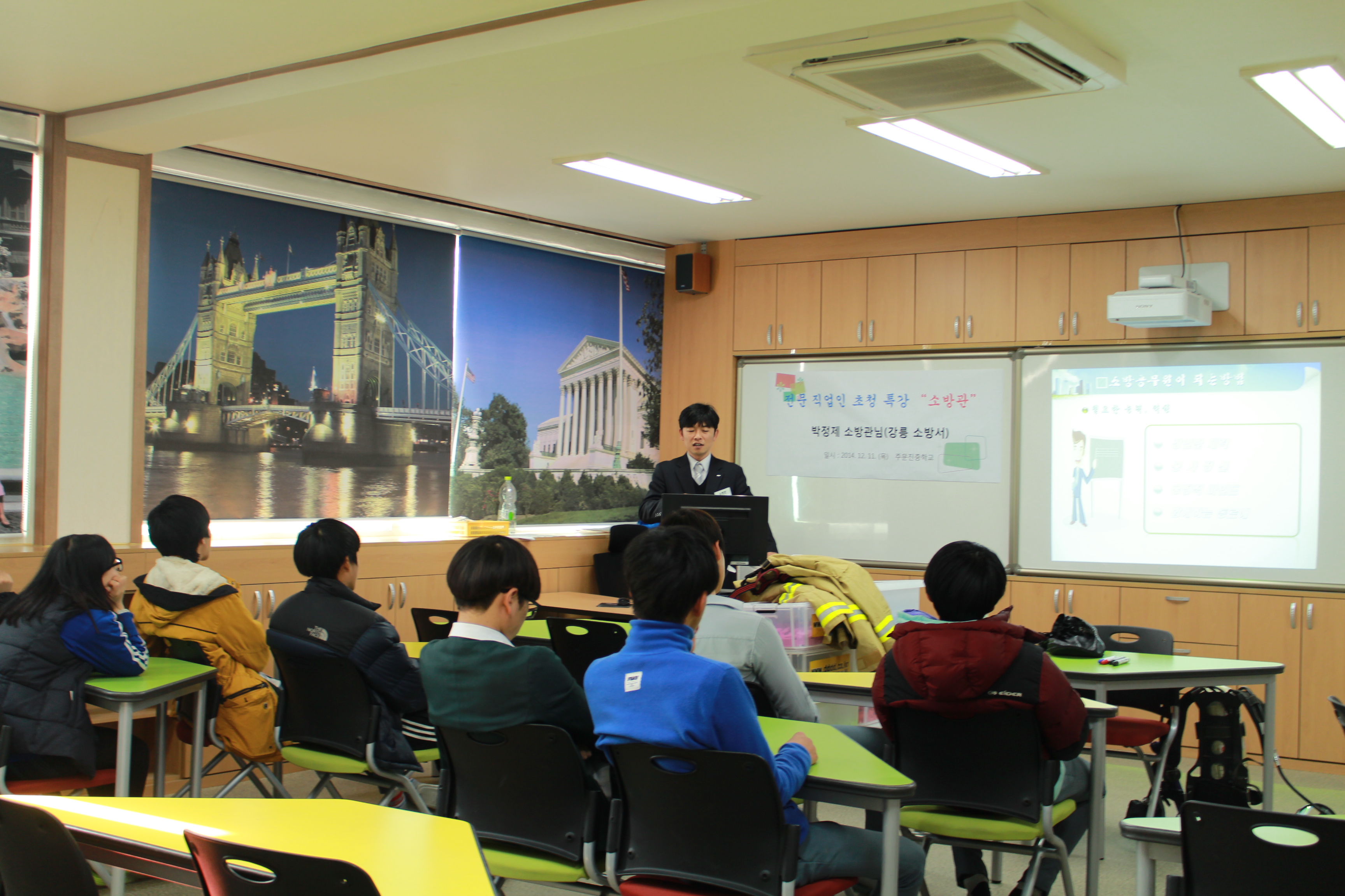 2014. 12. 11(화) 강릉소방서에서는 주문진중학교 3학년 학생을 대상으로 찾아가는 미래소방관 교실을 운영했다.