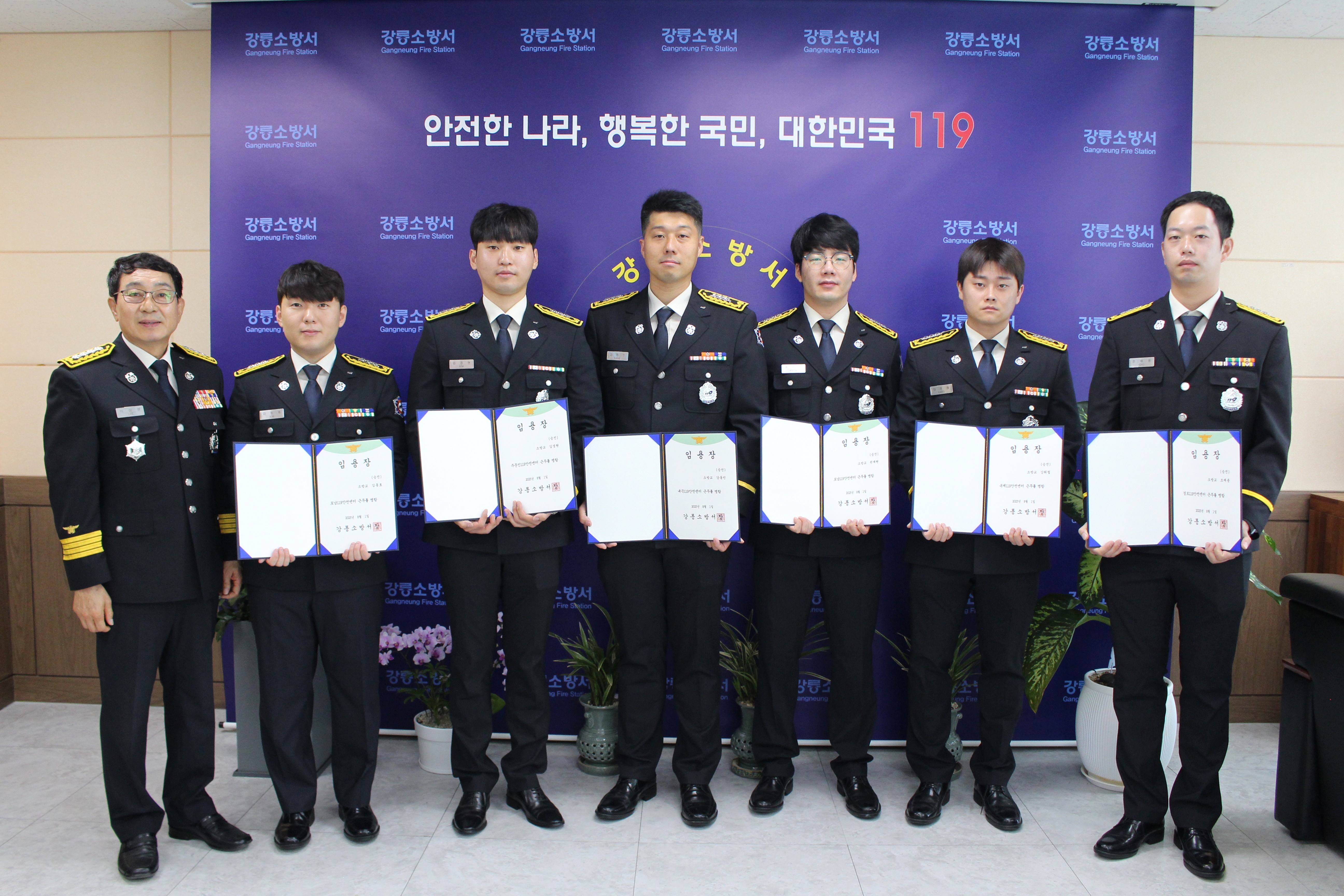 강릉소방서는 오늘 오전 9시 서장실에서 승진자 5명을 대상으로 신고식을 실시하였습니다.