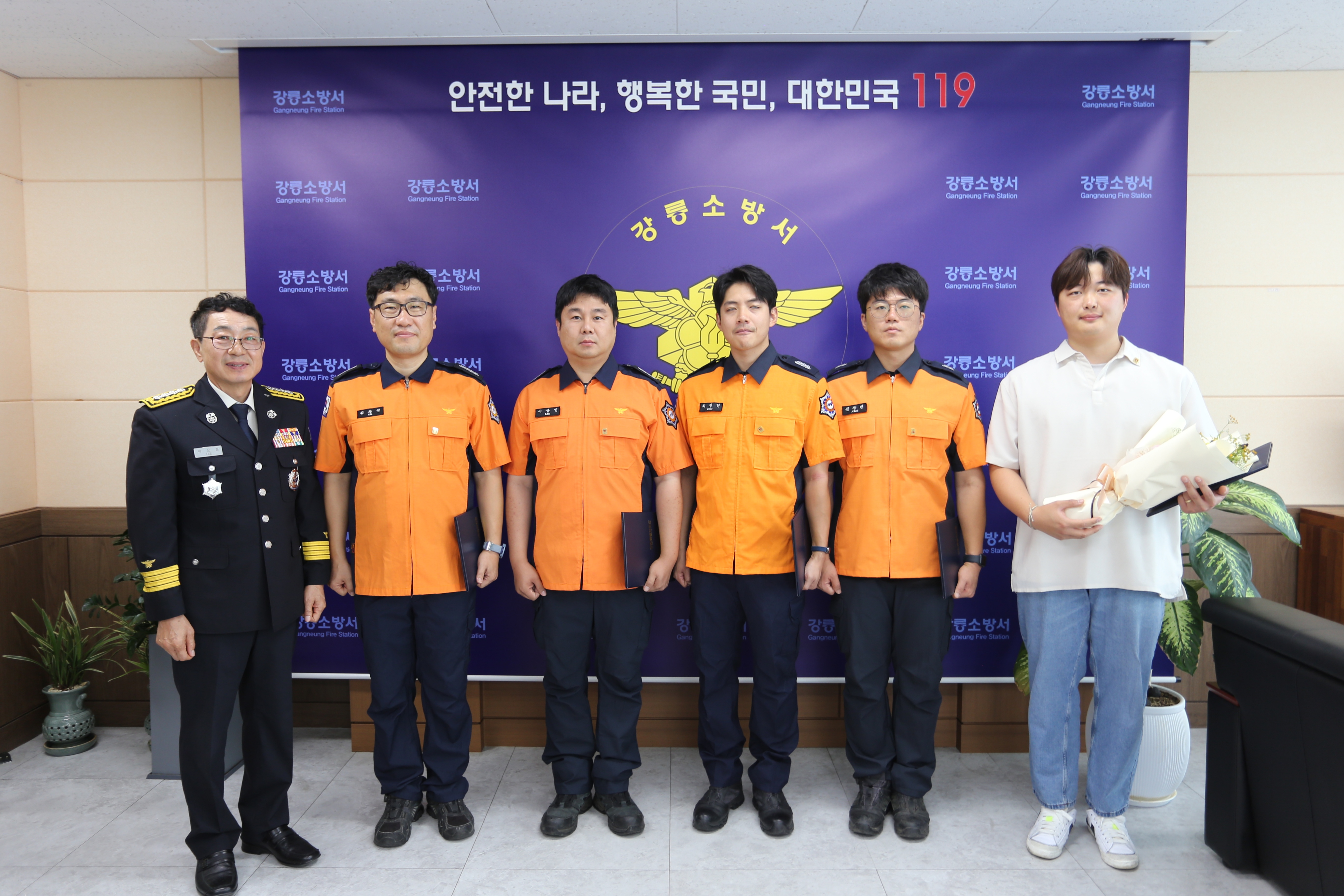 이날 수여식에는 강릉시청 김선희 행정지원과장이 참석하였으며, 하트세이버로 선정된 대원은 ▲소방장 김창규 ▲소방장 이상민 ▲소방교 최정현 ▲소방사 김창빈이 선정됐으며, 일반인은 ▲강릉시 소속 청원경찰 곽선규님이 선정되었습니다!