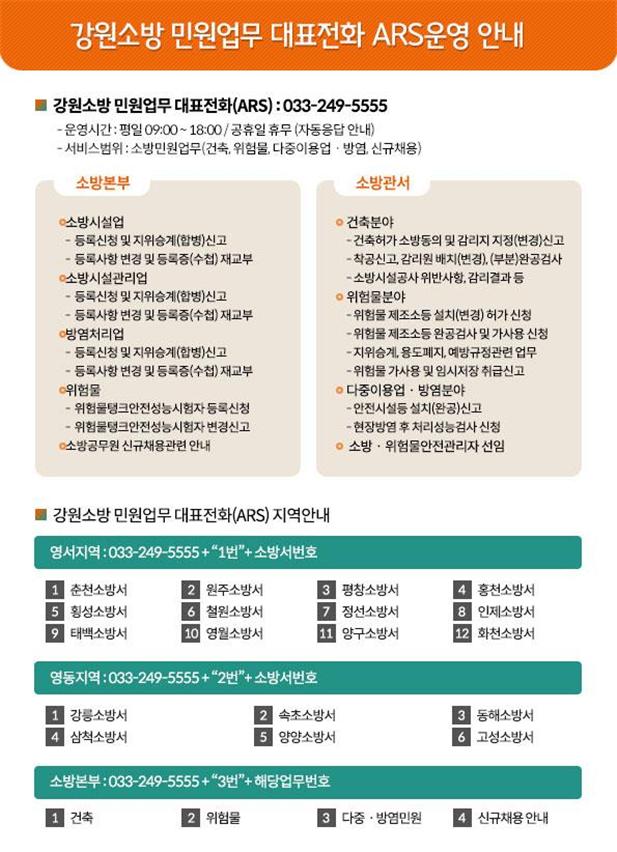 강원소방 민원업무 대표전화(ARS) : 033-249-5555 + "2번" + 고성소방서(6번)