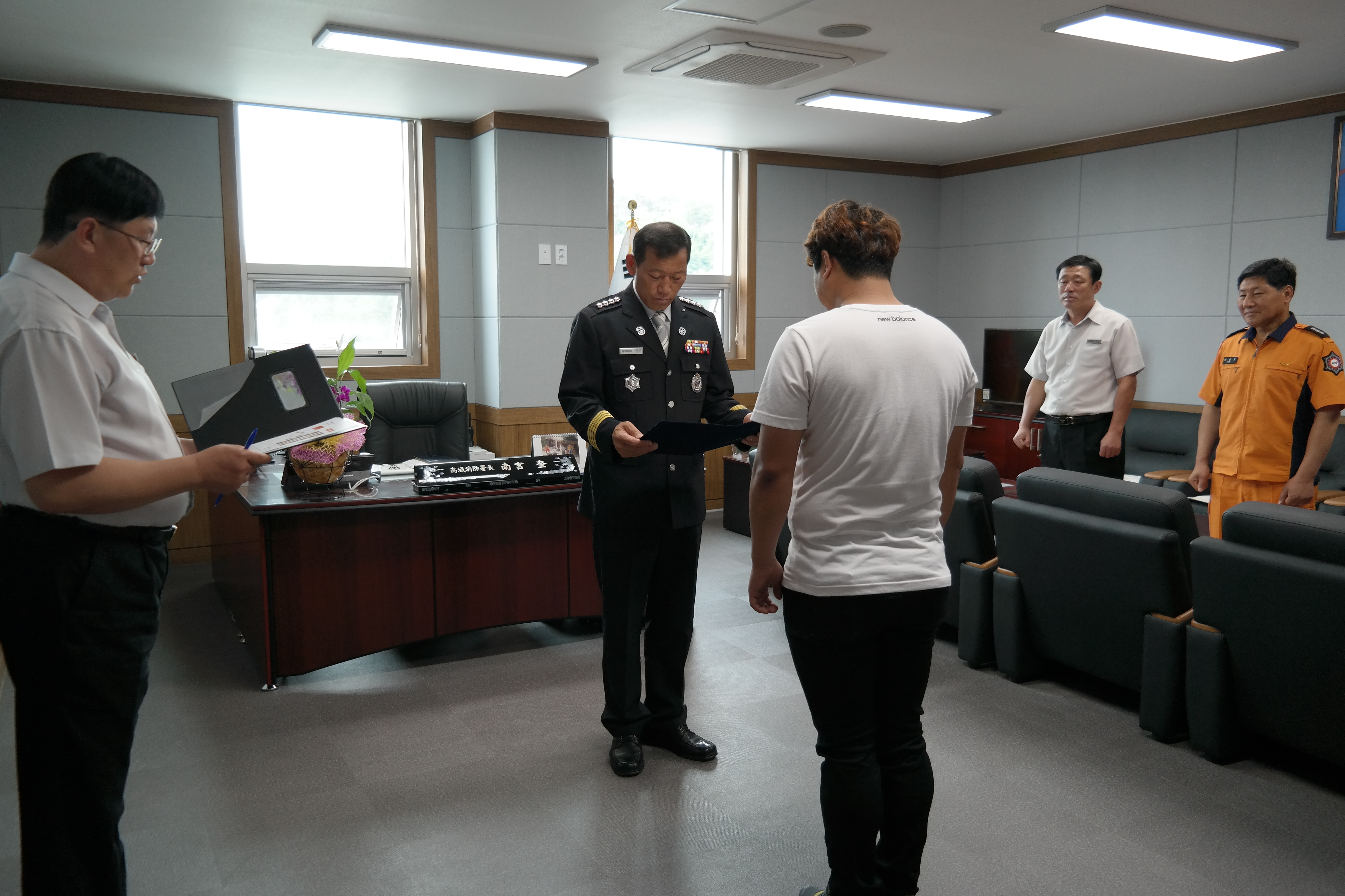 2015. 6. 8.(월) 서장실에서 화재의 신속한 초기진화로 인명과 재산보호에 큰 기여를 한 시민에 대하여 표창장을 수여했다.