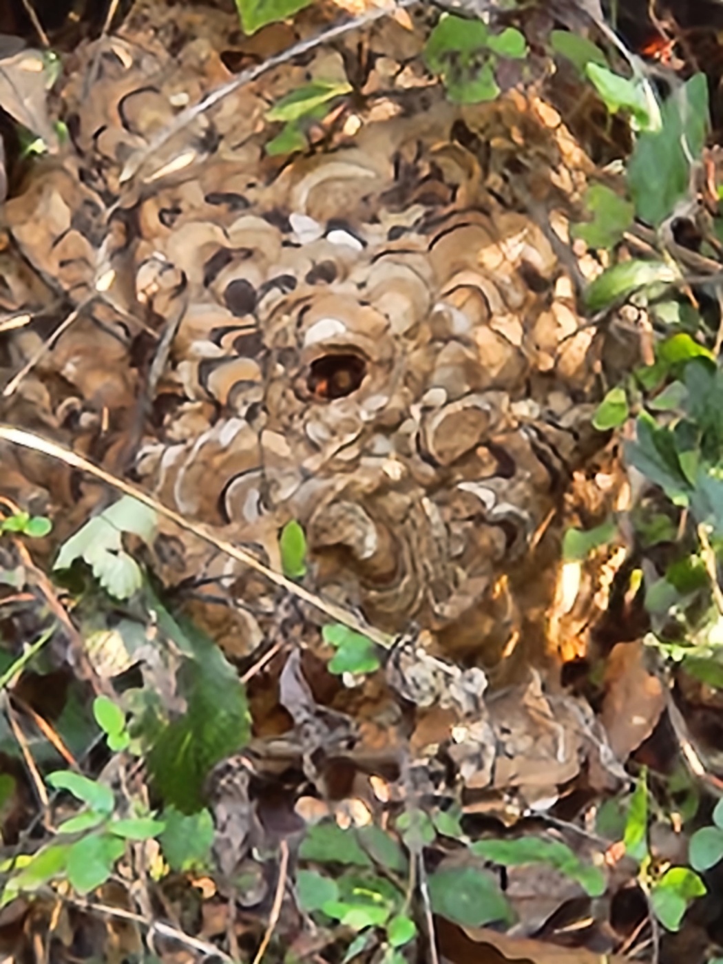가을철 들깨꺾기를 마무리하고 밭둑을 정비하다가 제 머리크기보다 조금 더 커 보이는 말벌집을 발견하였습니다