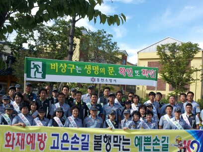 홍천읍 남.여의소대 합동으로 "국민생명보호정책"아래 플래카드 가두행진,전단지배포와함께 소방출동로 확보켐페인 을 실시하였읍니다,