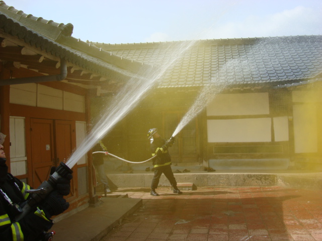 김학균 전통가옥을 대상으로 소방, 의용소방대, 경찰, 면사무소와 합동 소방훈련을