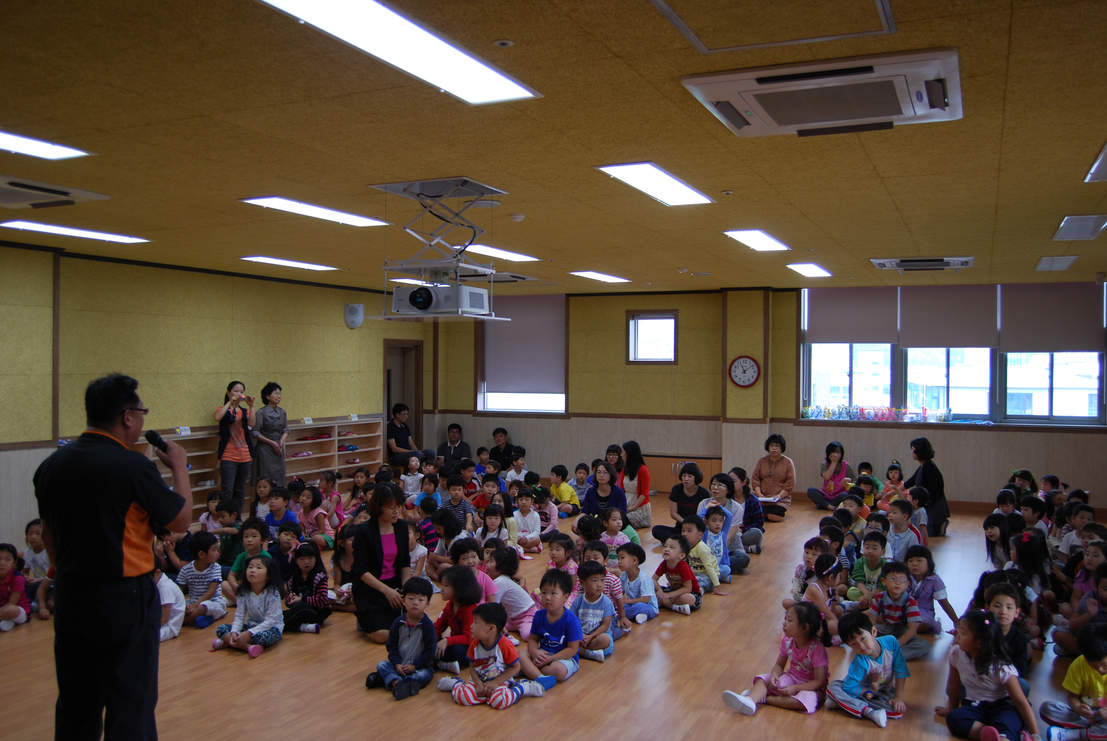 화재발생시 다수인원의 대피로 인한 안전사고 부담도 있어 위험상황에 동요 되지않고 효율적으로 안전하게 대피하는 능력을 배양하고자 실제상황처럼 연기를 발생시킨후 비상벨을 울려 1층 옥외 놀이터와 옥상으로 나뉘어 대피하는 훈련을 실시했다.