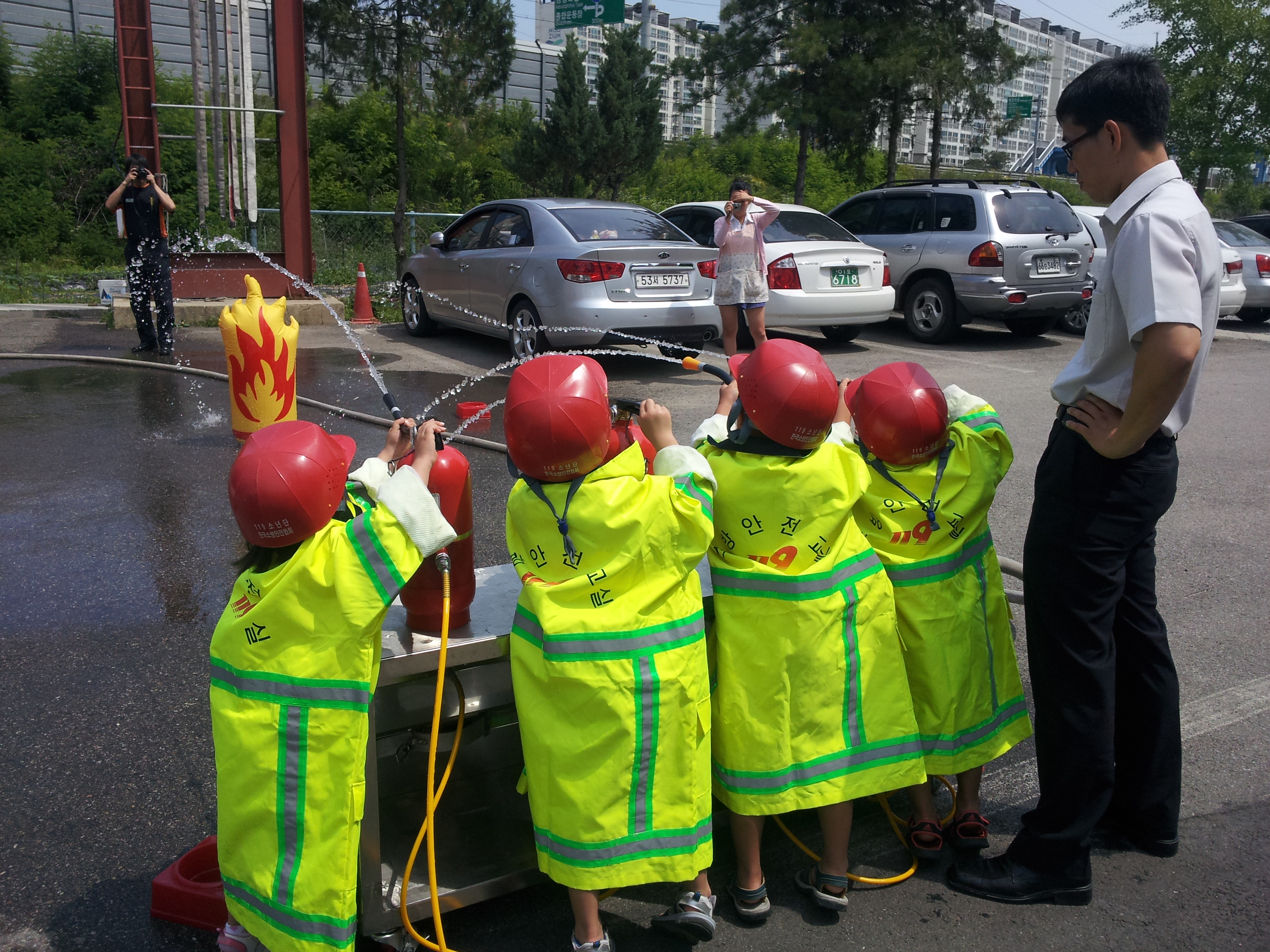 청명하고 맑은 날, 우리 소방서를 찾은 노랑 병아리(엘리트유치원생, 원장 왕복자) 15명을 대상으로 소방에 대한 멋지고 좋은 이미지를 알리고 원생들에게 물소화기 체험 등으로 소방과 안전에 대한 꿈과 사랑을 한 보따리 안겨주었다.