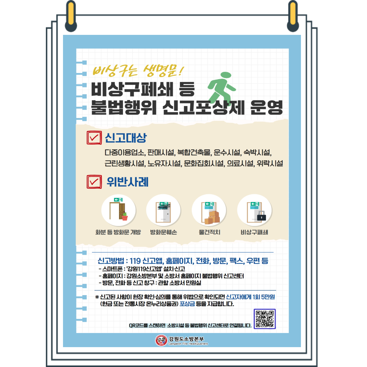 | 969 | 홍천소방서, 비상구폐쇄 등 불법행위 신고포상제 운영(연중) | 홍천홍보 | 2022-07-25 | 670 | |