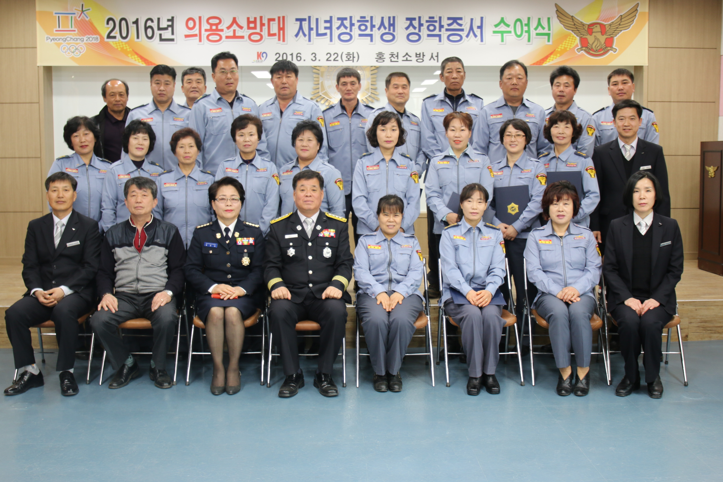 홍천소방서에서는 22(화) 오전 10시에 대회의실에서 홍천남·여의용소방대연합회장등이 참석한 가운데 관내 모범의용소방대원 자녀중 학업성적이 우수하고 춤행이 방정한 학생 42명을 선발하여(고고생3, 대학생39) 선발하여 ‘2016년도 의용소방대원 자녀 장학증서 수여식’을 가졌다.