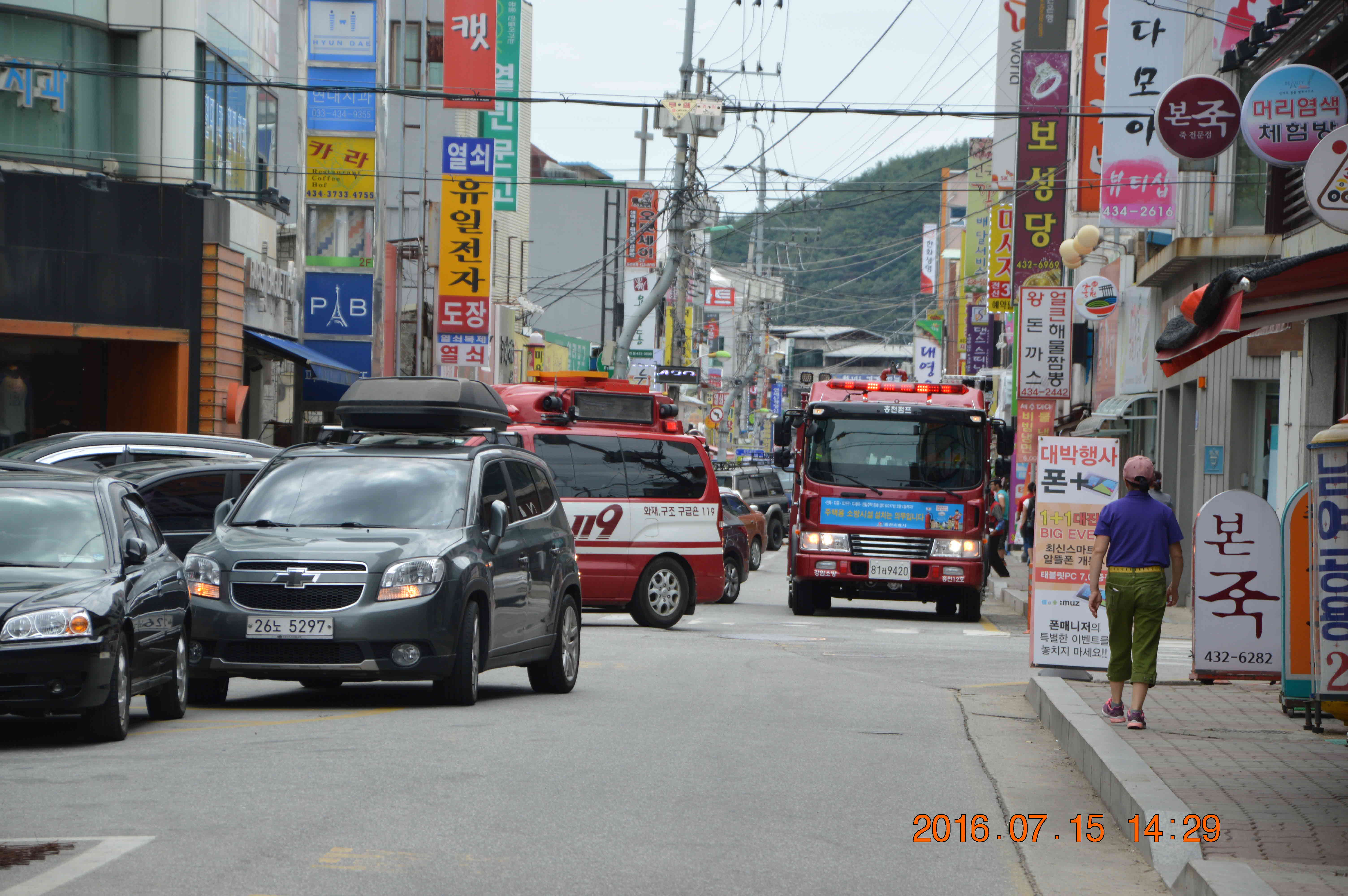 □ 이번 훈련은 민방위 훈련과 병행하여 실시하는 것으로 공습경보 종료 후 출동지령에 따라 「소방차 길 터주기」긴급출동 훈련을 실시하는 것을 시작으로, 홍천전통시장 연합 상인회 회장 등 시장 관계자도 함께 출동차량에 탑승하여 전통시장 등 소방차 진입곤란 지역에서 소방차 길 터주기 동승체험을 병행하였다.