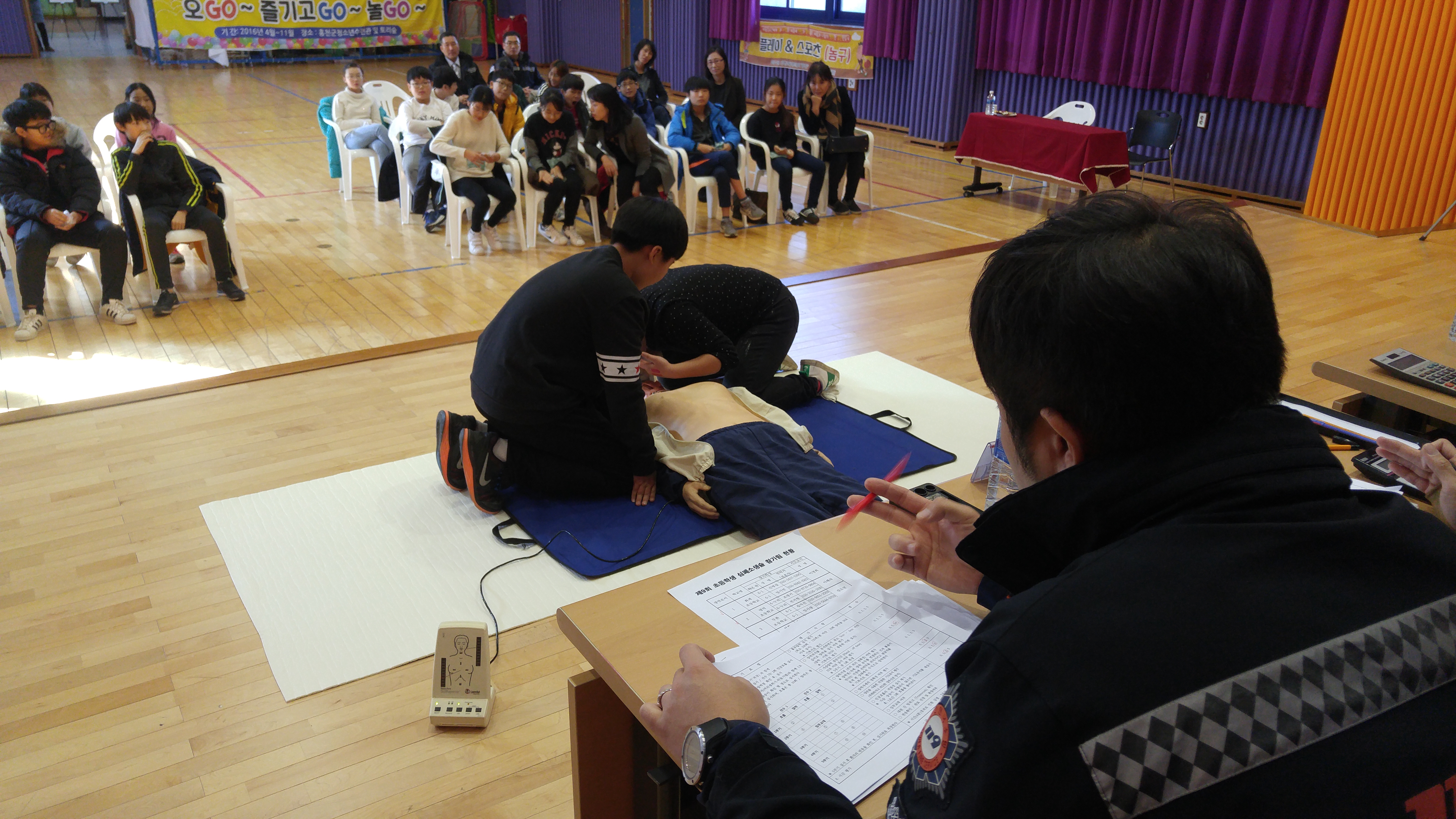 이번 심폐소생술 경연대회는 올해로 아홉 번째를 맞이해 홍천군내 각 초등학교 대표 10개팀이 참가하여 심장이 멈춘 위급환자를 살리기 위해 하는 심폐소생술을 2인 1조로 팀을 만들어 얼마나 신속하고 정확하게 펼치는지 그 실력을 겨루었습니다.
