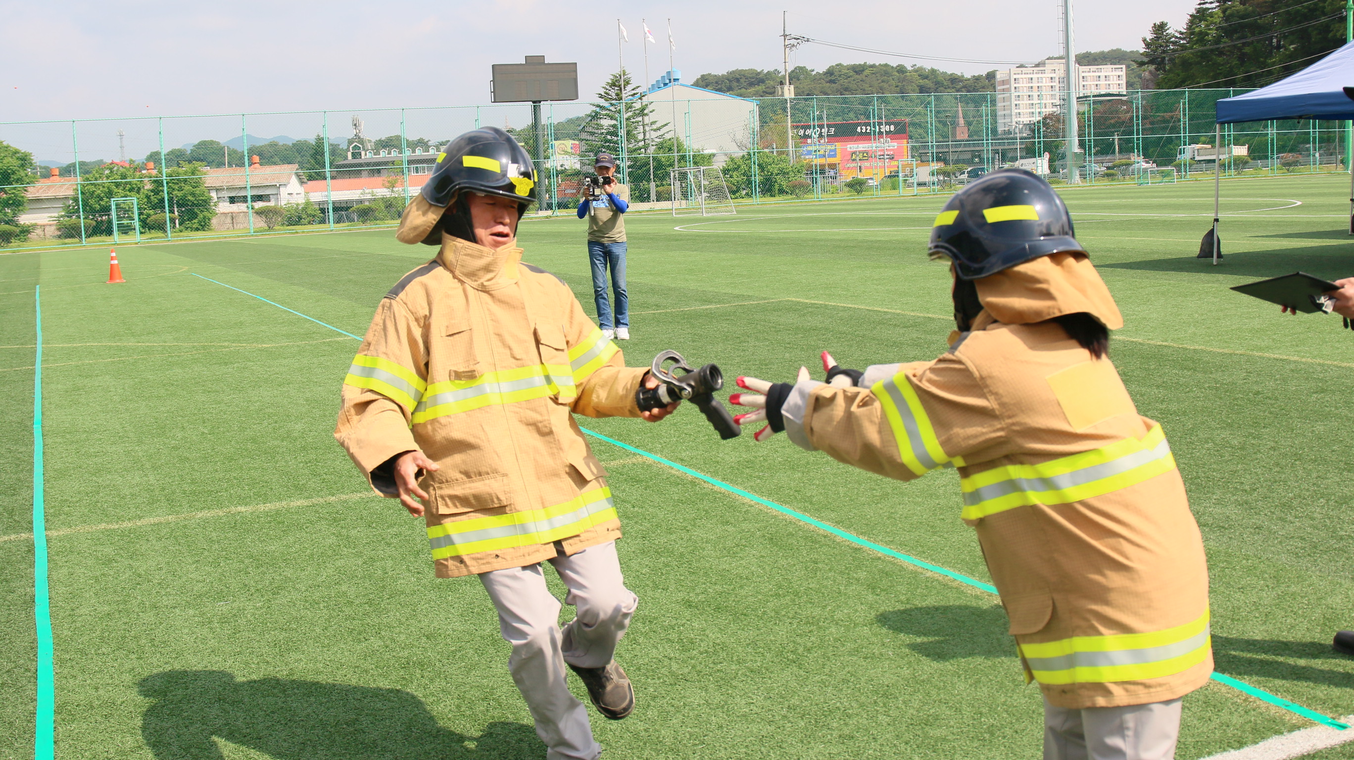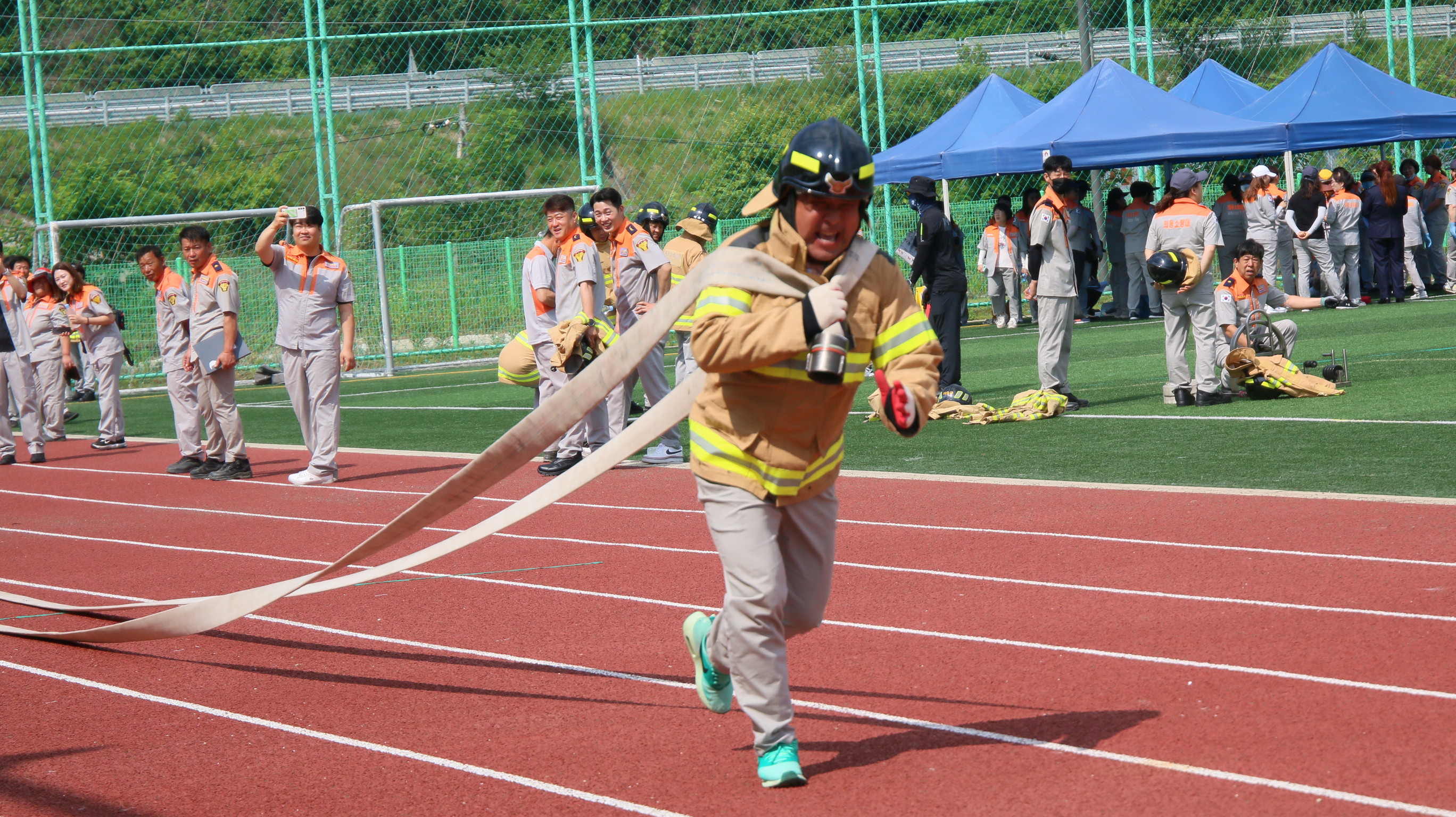 이날 기술경연 대회는 ▲남·여 소방호스 끌기 ▲수관연장·방수자세▲개인장비착용 릴레이 ▲심폐소생술 종목으로,
