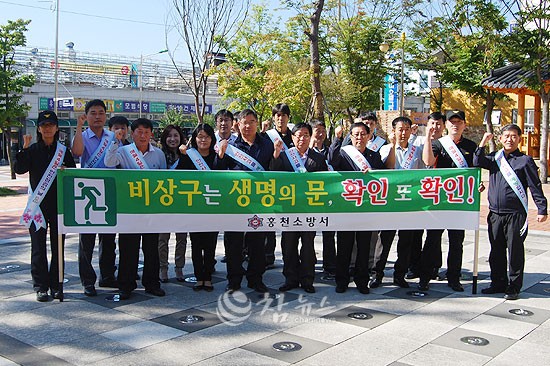 [언론보도-2]【홍천=참뉴스】강원 홍천소방서(서장 이종진)는 24일 홍천군 중앙시장에서 안전한 추석보내기를 위해 홍천군청, 홍천경찰서 직원 등이 참석한 가운데 유관기관 합동 안전점검을 실시하고, 비상구 및 계단등 피난통로 환경개선을 위한 비상구 불법행위 근절 캠페인을 실시했다.
