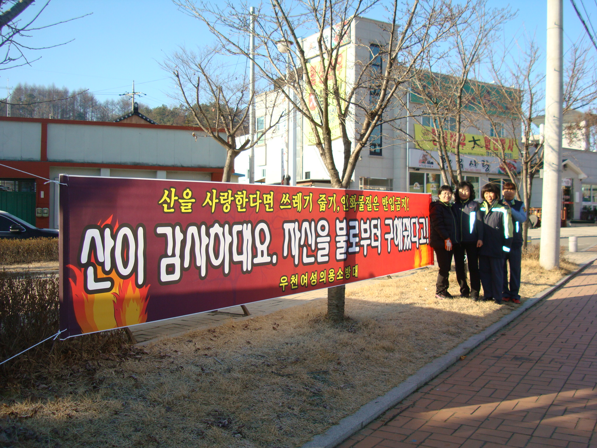 횡성소방서(서장 조근희) 소속 우천여성의용소방대(대장 원정숙)은 2011.12.13일 화재와의전쟁 캠페인을 실시하였습니다. 이번 캠페인 활동에는 우천여성대에서 새로 제작한 입간판과 홍보 플랜카드가 사용되어 더 큰 홍보효과가 나타났습니다. 캠페인 활동뒤에는 관내 환경정화 활동까지 하시는 꼼꼼함을 과시(^^?)하셨습니다.