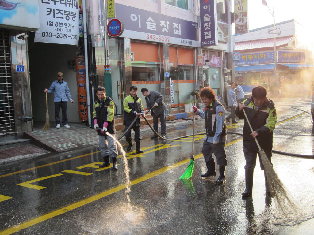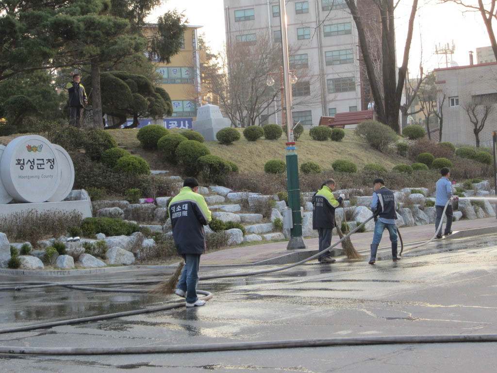4월 19일 오전 6시부터 횡성의소대에서는 횡성시가지 물청소를 실시하였습니다.