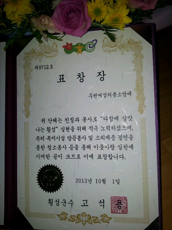 횡성군에서 주는 2013년 한해 이웃사랑실천상을 우천여성의용소방대가 수상하였습니다