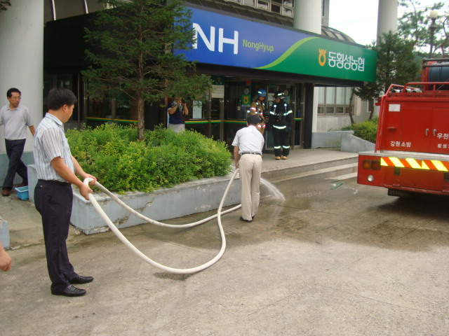 횡성소방서(서장 조근희) 우천 119 안전센터 에서는 2011년 8월24일(수) 동횡성 농협 본점을 방문하여 우천펌프1호 우천구급 을 이용하여 현지 출동적응훈련을 실시하였고, 옥내소화전 점검 및 방수시연, 소화기 사용법, 유사시 초기진화 및 대피요령을 교육하였습니다.
