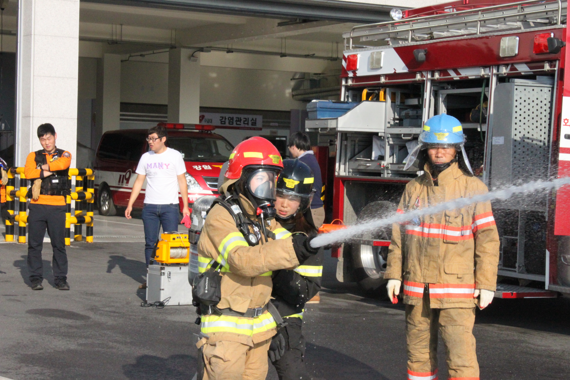 소방서 견학을 왔습니다. 소방서 업무 소개, 방수체험, 구조장비 조작체험 등 다채