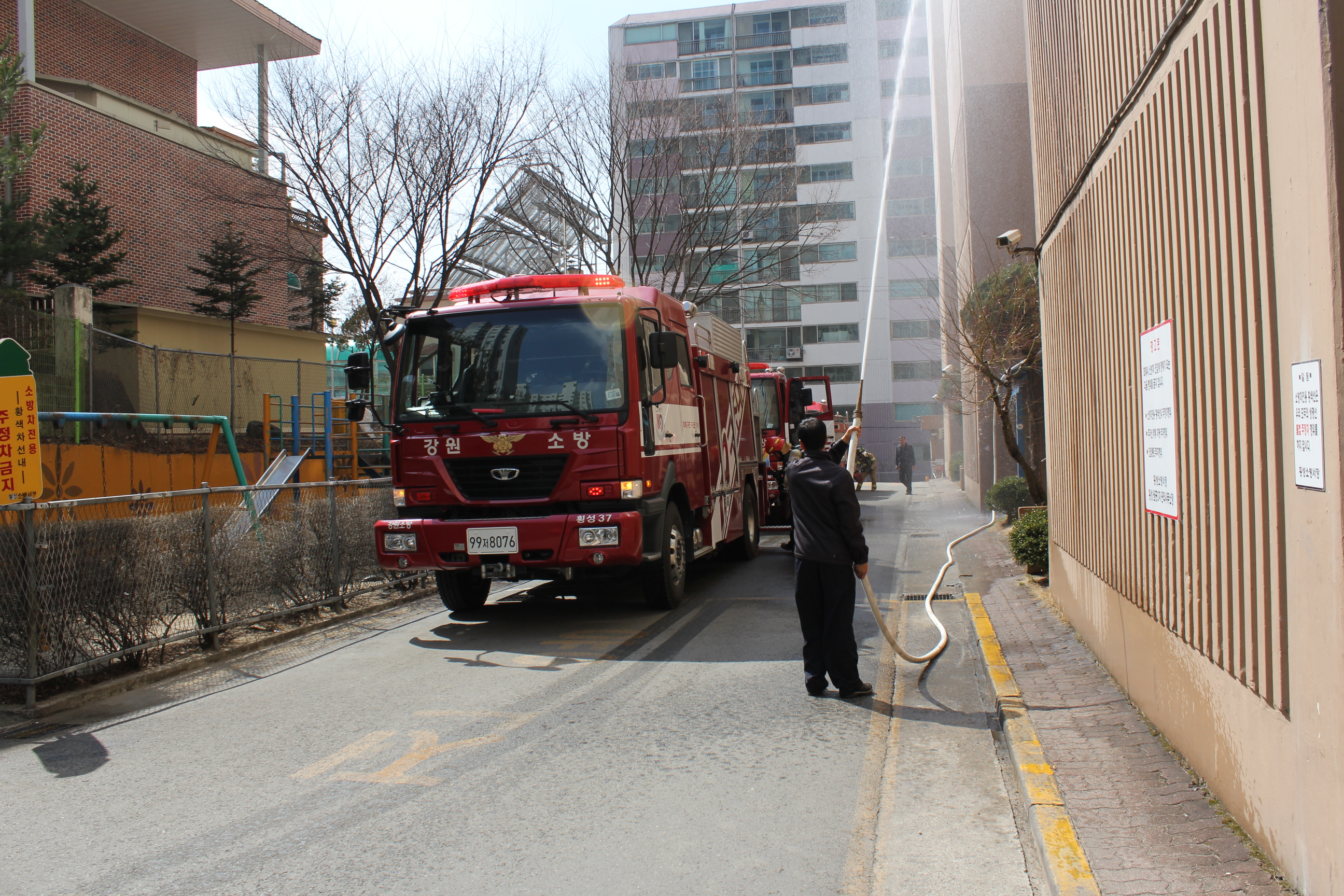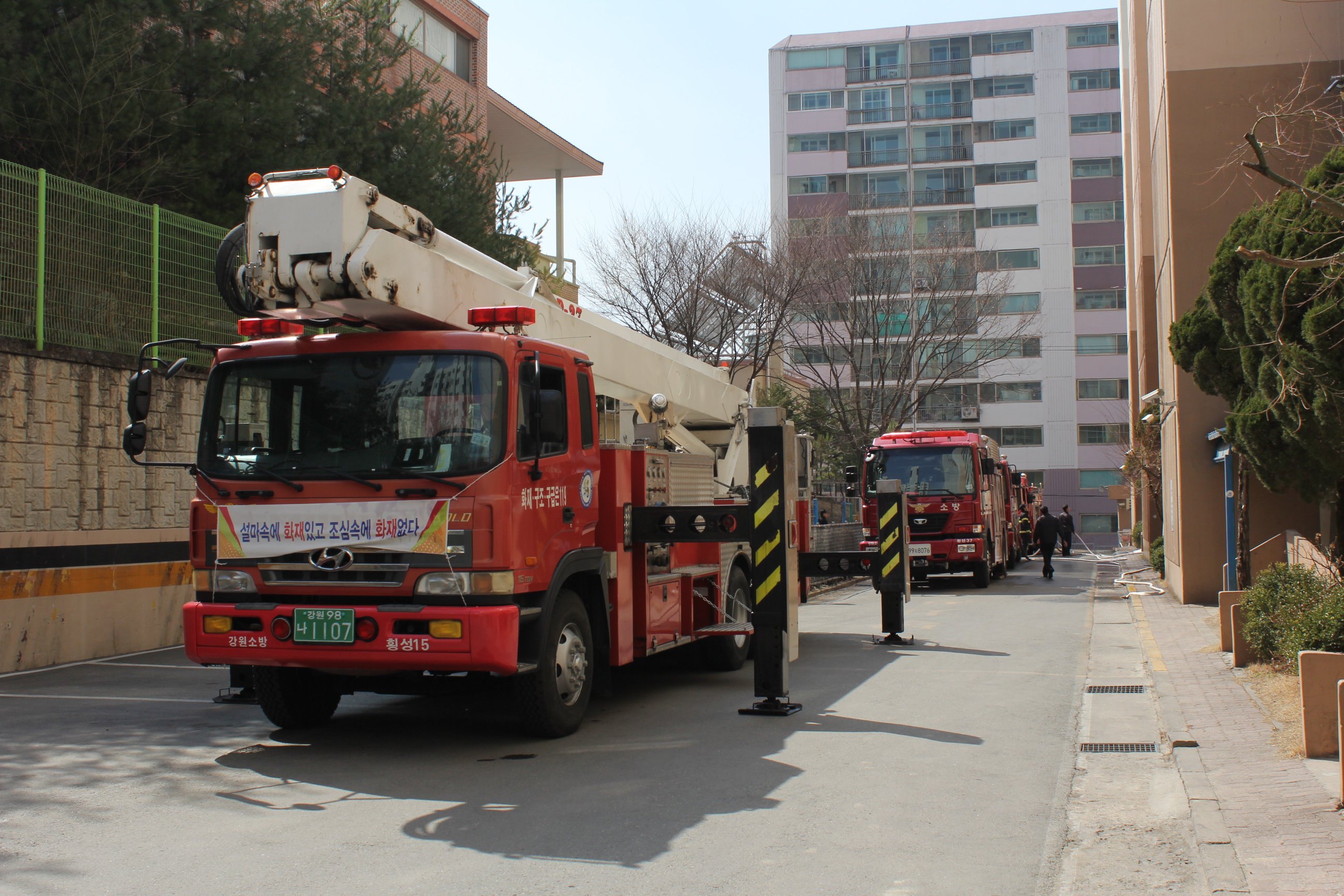 횡성소방서(서장 조근희) 횡성119안전센터에서는 금일 14시경 횡성읍 읍하리 소재 원흥2차아파트에서 고층건물적응훈련을 실시하였다. 이번 훈련은 아파트 내 화재발생 시 자위소방대 및 소방대의 현장대응능력을 향상시키고자 실시하게 되었으며, 앞으로 지속적인 소방안전교육 및 소방훈련을 통하여 인명, 재산피해를 줄이고자 노력할 것이다.