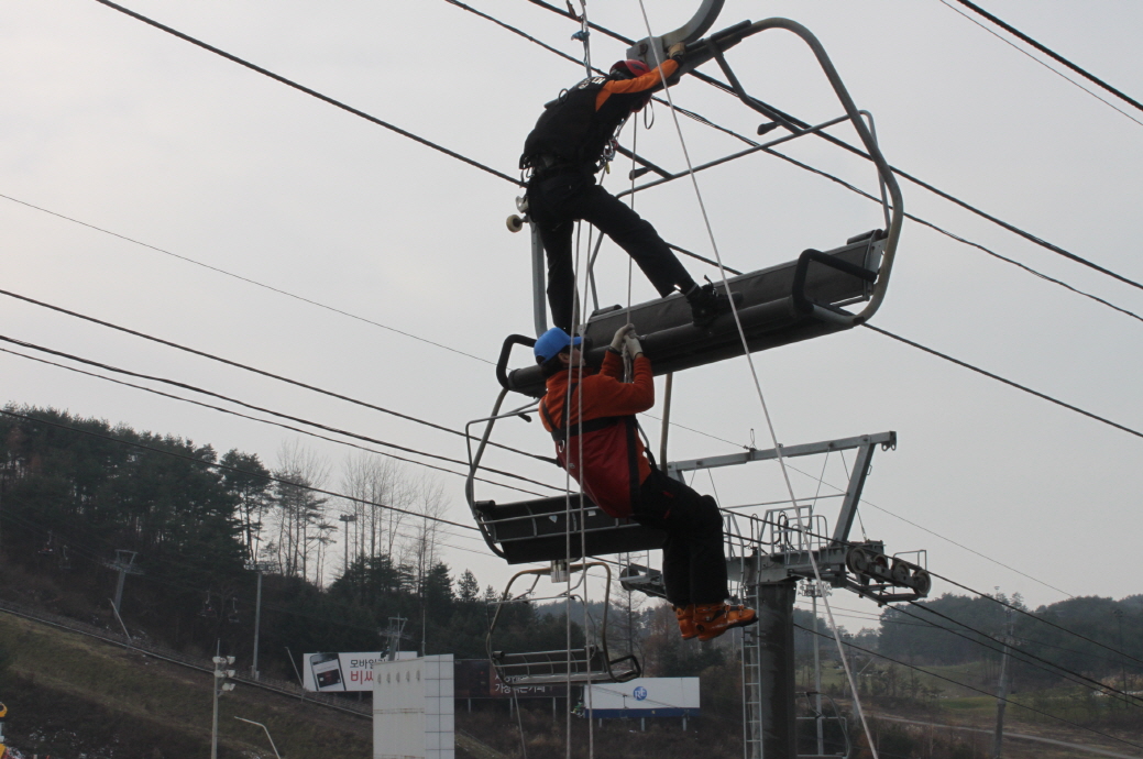 횡성소방서(서장 정은철)는 22일 오후 2시 둔내 웰리힐리파크에서 소방대원13명, 자체안전요원 70여명과 스키장리프트 안전사고에 대비한 인명구조훈련을 실시했습니다. 이 날 훈련은 스키장 리프트 정지 시 구조요령 및 부상방지를 위한 소방안전교육을 중점적으로 실시하였으며, 화재예방 및 '생명을 구하는 사람들' 심폐소생술 홍보캠폐인도 병행 실시하였습니다.