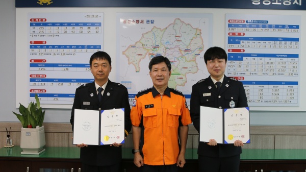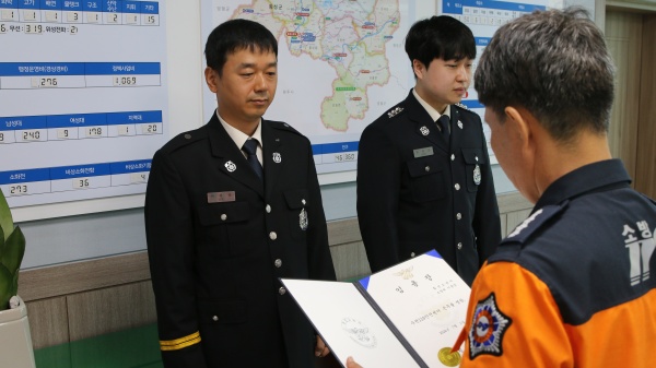 이날 수여식은 각 과장ㆍ팀장 등이 참석한 가운데 복직자 원병연 소방교와 승진자 이몽영 소방위를 대상으로 진행됐습니다.