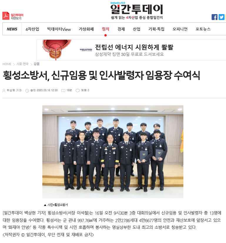| 2423 | 횡성소방서 신규 임용, 인사발령자 임용장 수여식 | 횡성홍보 | 2020-03-16 | 1092 | |