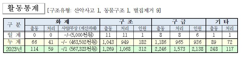 ○ 구조 11건(산악사고 1, 동물구조 1, 벌집제거 9)