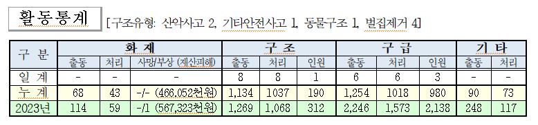 ○ 구조 8건(산악사고 2, 기타안전사고 1, 동물구조 1, 벌집제거 4)