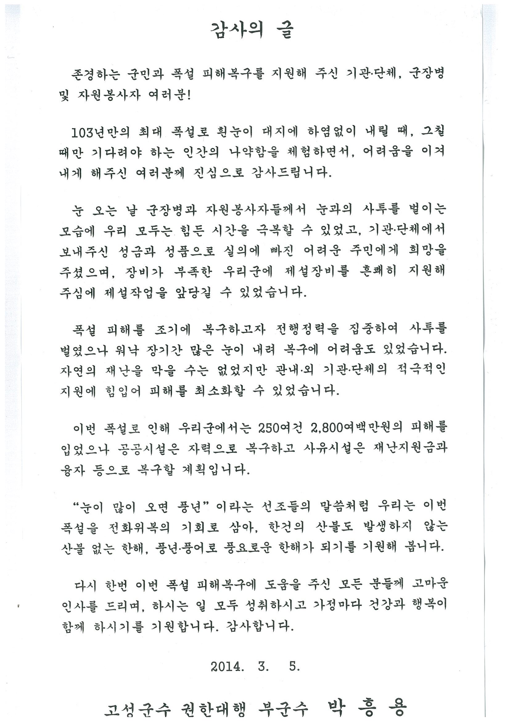 감사의 글(폭설 피해복구 지원)