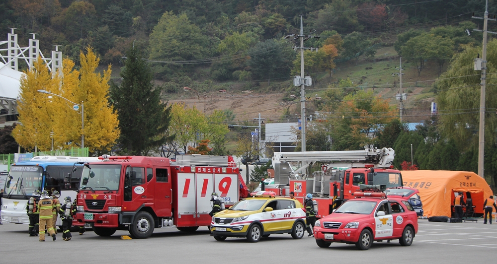 인제소방서(서장 김용락)에서는 10.29.(화) 15시 인제군청외 33개 유관기관과 합동으로 2013년 인제군 재난대비 긴급구조종합훈련을 실시하였다.