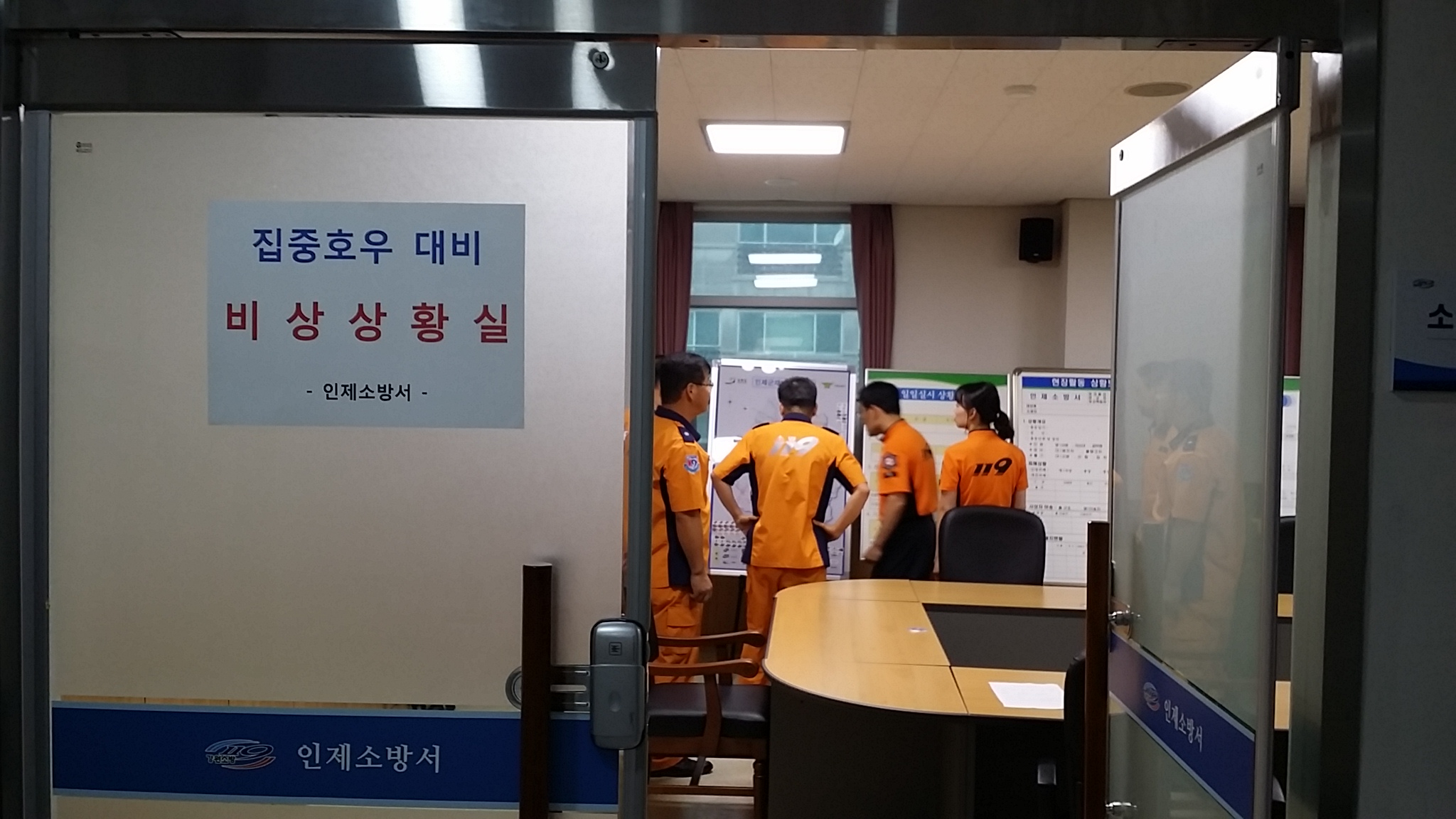 인제소방서는 인제지역에 하루사이 200mm가 넘는 많은 양의 비가 내림에 따라 소방서 소회의실에 비상상황실을 운영, 각종 재난상황에 대비하였으며, 피해가 발생한 지역에 소방인력을 투입해 신속한 출동과 안전조치를 취하였다.