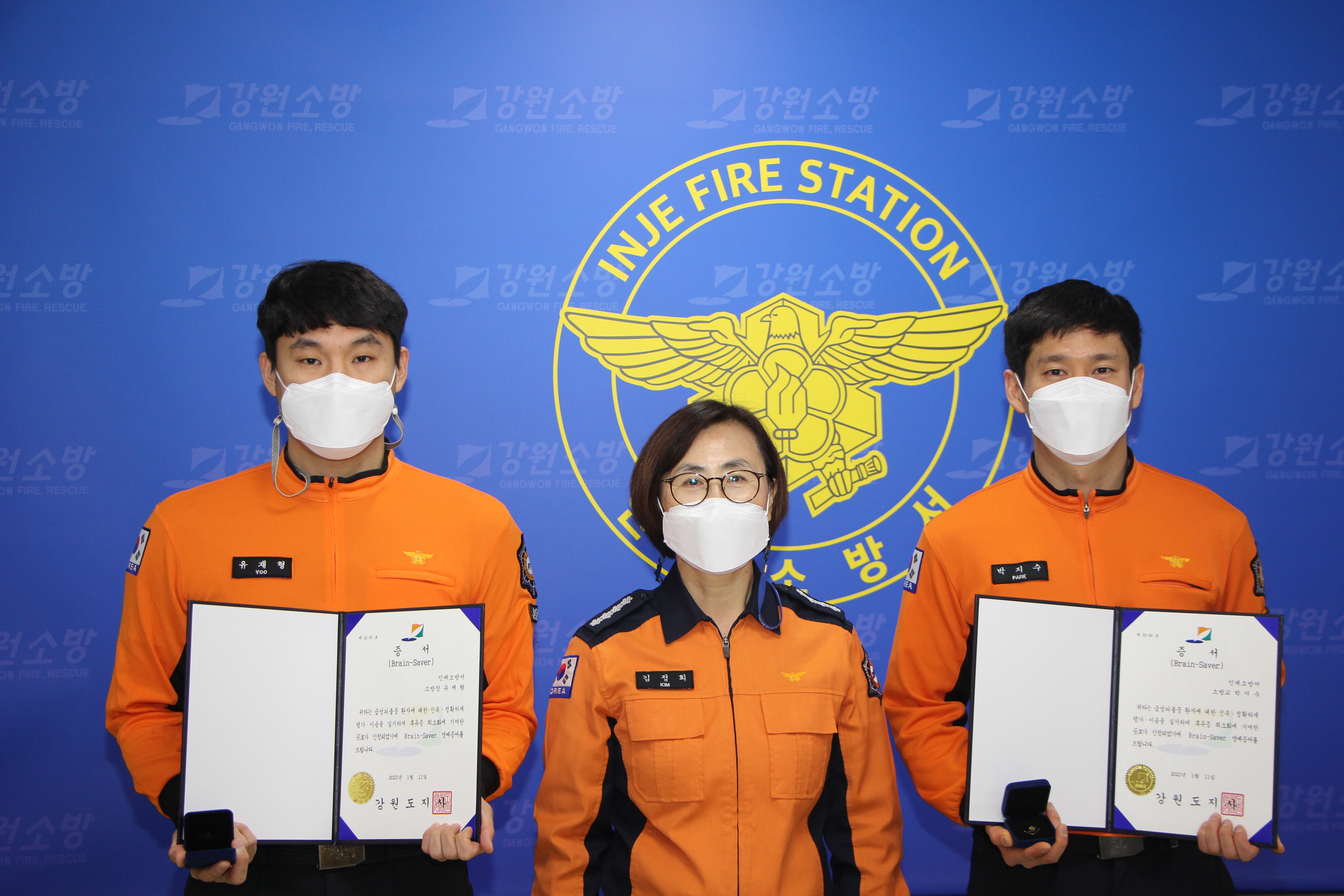 ○ 인제소방서 소방장 유재형과 소방교 박지수는 지난해 9월 23일 오전, 의식이 이상하다는 신고로 출동해 뇌졸중 환자에 신속한 응급처치를 실시, 전문적인 치료가 가능한 적정 병원으로 이송하여 후유증을 최소화하는 데에 기여해 증서를 받게 됐다.