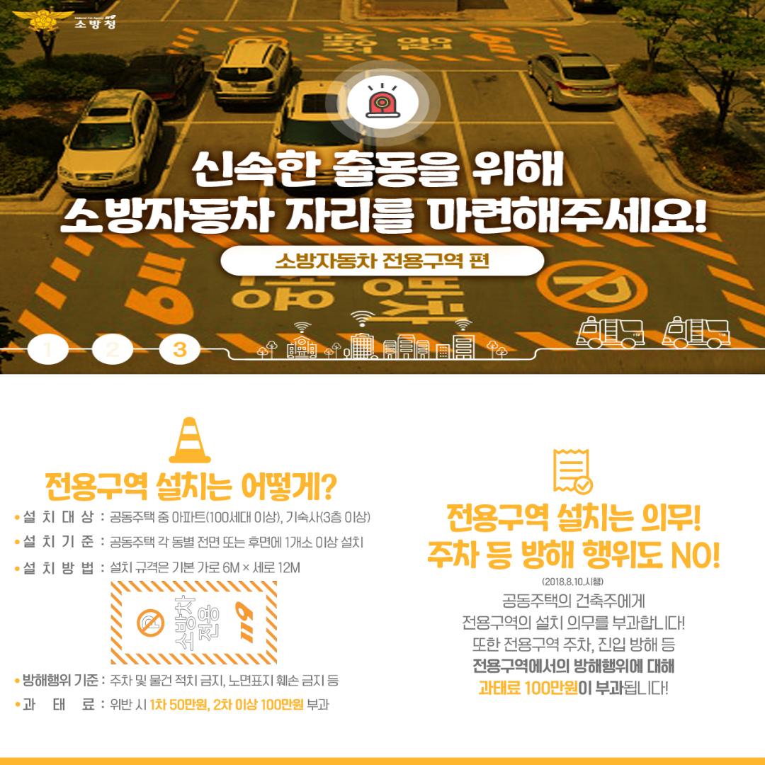 재난 발생 시 신속한 출동과 원활한 소방 활동을 위하여 단지 내 소방차 전용구역 확보를 적극 참여해 주시길 바랍니다.