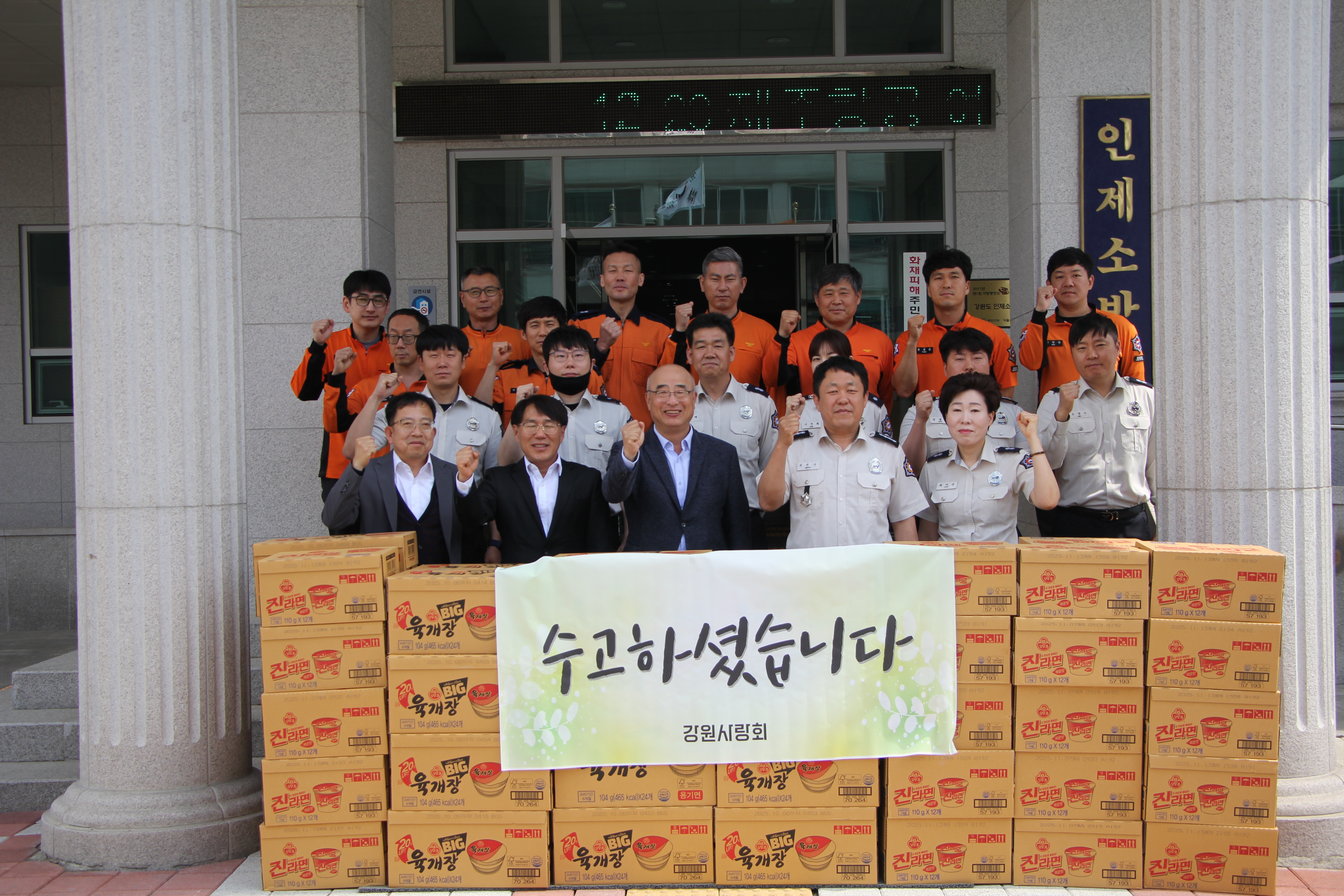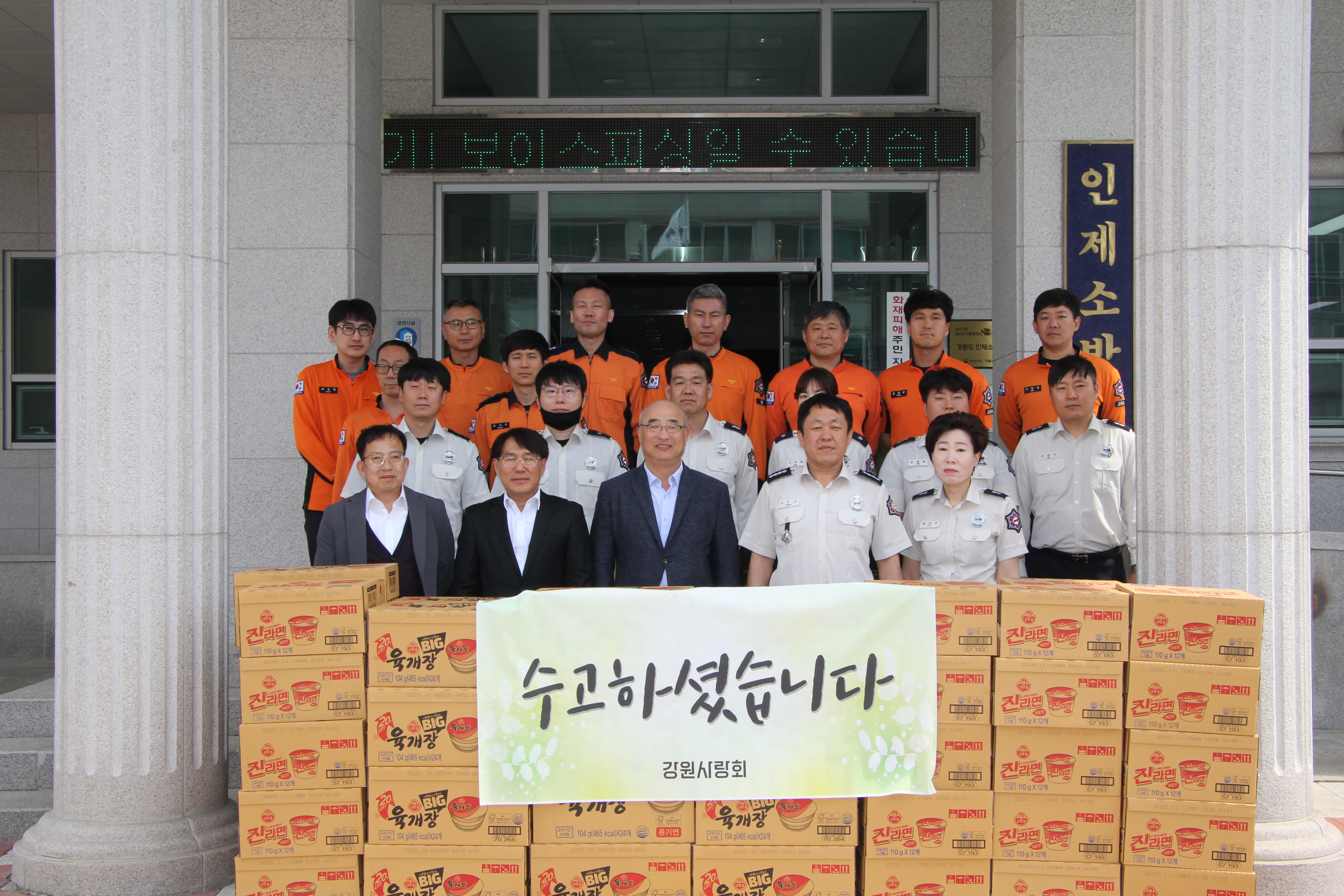 금일 강원사랑회에서 인제소방서를 찾아 산불 진화 작업에 대한 노고를 격려하며 위문품을 전달하였습니다.