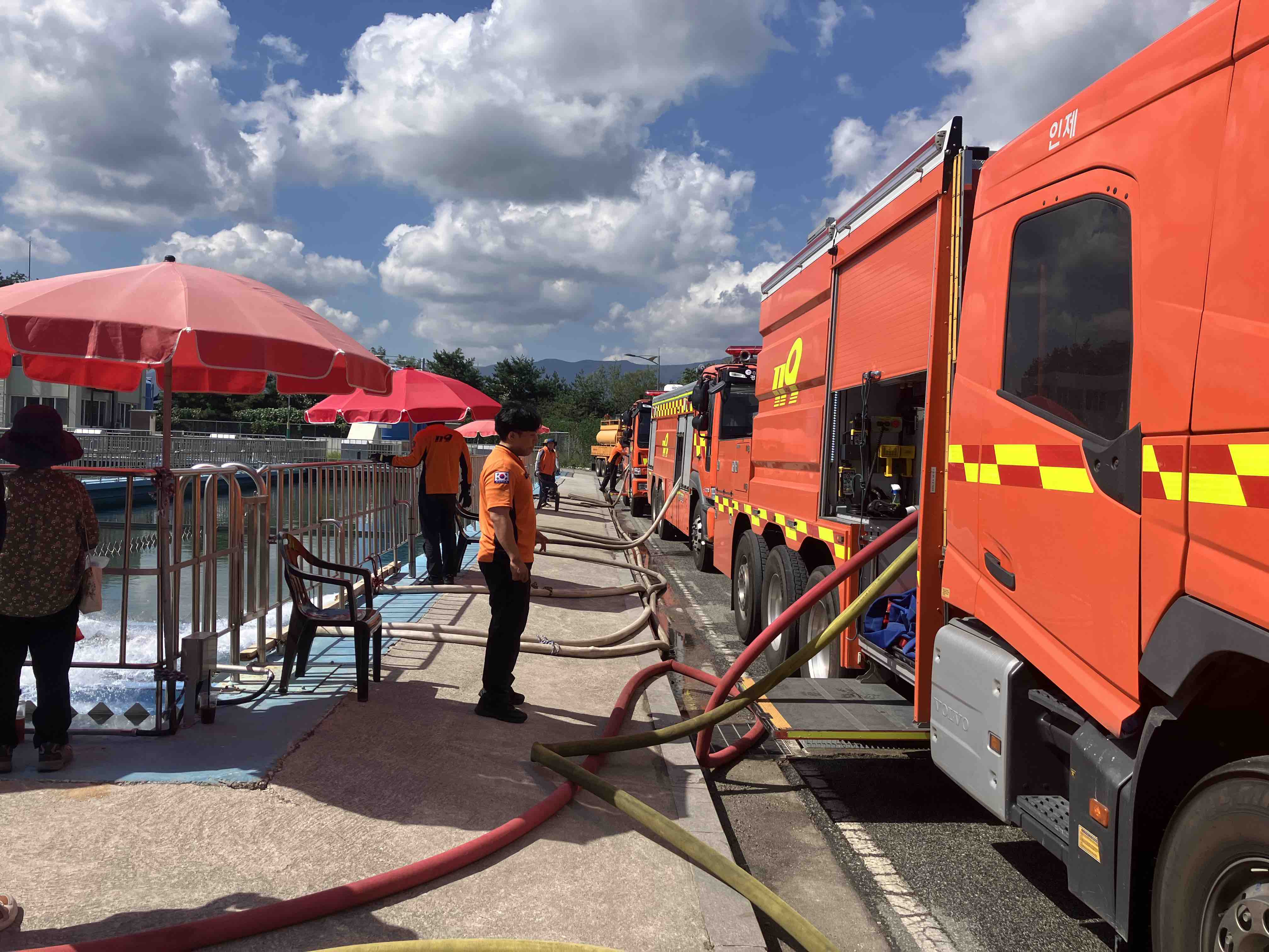 인제소방서는 운용 중인 다기능화학차를 지원차량으로 출동시켜 홍제정수장에 일일 50t 규모의 급수지원을 진행하고 있습니다.
